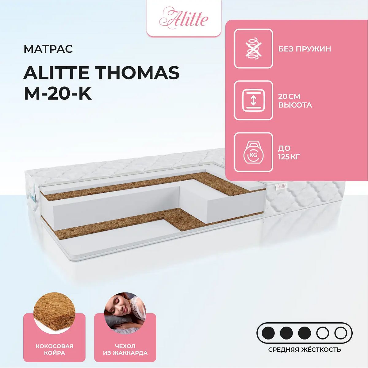 Матрас «Alitte Thomas M-20-K» — средней жесткости, которая подходит большинству людей среднего телосложения. Это — универсальный вариант и детям, и взрослым, и пожилым людям.
