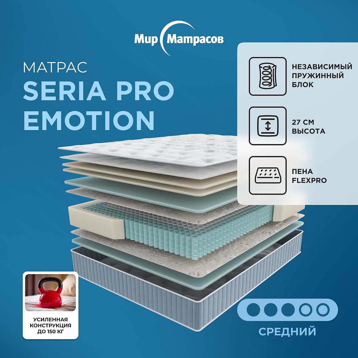 Матрасы премиальной линейки Seria Pro – это не только уют, комфорт и спокойствие, которые вы ощущаете, лежа на матрасе. Это заряд энергии и хорошего настроения, который дарит вам крепкий сон.Состав одностороннего матраса EMOTION: