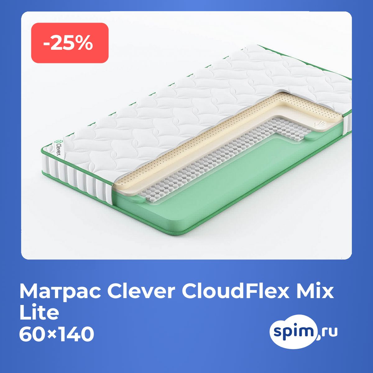 Комфорт и поддержкаГибридная конструкция матраса сочетает в себе мягкость и упругость, создавая комфорт для ежедневного сна. Мемориформ дарит ощущение мягкого облака, латекс добавляет упругость, а нанопружины обеспечивают точечную поддержку без эффекта «гамака». Благодаря отсутствию кокосовой койры, матрас особенно приятен для любителей мягких спальных поверхностей. Советы по уходуДля сохранения чистоты и продления срока службы матраса рекомендуется использовать защитный наматрасник (не входит в комплект). Чистку чехла проводить согласно рекомендациям по уходу за трикотажем. О производителеБренд Clever с 2014 года выпускает матрасы в Подмосковье, сочетая современные технологии и качественные наполнители. Коллекция Cloud — это выверенный баланс цены и качества, комфорт и надежность для сна в любом стиле интерьера. Матрас Clever CloudFlex Mix Lite подойдёт тем, кто ищет мягкий матрас с эффектом памяти, комбинированную поддержку и современный внешний вид.