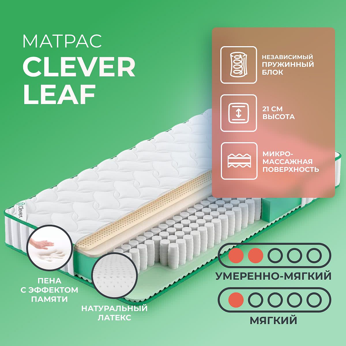 Нагрузка на спальное место, кг: 100. Высота, см: 21. Матрас скручен в рулон. Матрас Leaf от бренда Clever создан на базе современного блока независимых пружин TFK, который содержит 500 автономных пружин на каждое спальное место. Пружины вложены в ячеистые чехлы, жесткая связь между пружинами отсутствует, поэтому матрас способен правильно принимать нагрузку спящего. Стороны у матраса разные. С одной стороны проложен конволюторный пенополиуретан со специальным рисунком, который дает микро массажное действие. За счет ребристой структуры расслабляются мышцы и снимается напряжение с суставов и конечностей. Сторона с массажным эффектом умеренно-мягкая. Другая сторона — мягкая и состоит из двух наполнителей: Мемори, который помнит форму тела (не имеет обратного давления) и конечный слой натурального латекса, который славится своей анатомичностью за счет высокой эластичности и упругости. Все материалы безвредные, хорошо пропускают потоки воздуха, а их структура не способна впитывать влагу.