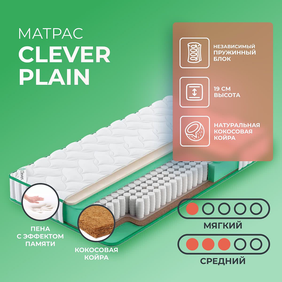 Нагрузка на спальное место, кг: 110. Высота, см: 19. Матрас скручен в рулон. Двусторонний матрас Plain от Clever имеет в своей основе блок независимых пружин TFK. Работа каждой пружины в этом блоке никак не зависит от соседней — пружины помещены в специальные мешочки и не имеют между собой жесткой связи. Поэтому, матрас способен точечно принять нагрузку спящего. Сторона средней жесткости выполнена с использованием натуральной кокосовой койры и современного пенополиуретана. Кокос дает жесткость, а пенополиуретан служит смягчающим слоем. Кстати, кокосовые волокна способны оказать правильную поддержку человеческого тела во время сна и отдыха. Мягкая сторона изделия проложена с использованием 2-х слоев: пенополиуретана и “Мемори”. Материал обладает эффектом памяти формы, то есть способен сжиматься под воздействием тепла и нагрузки, обеспечивая максимальный комфорт человеку. Мемори придумали ученые космических агентств для использования в скафандрах и креслах космических кораблей.
