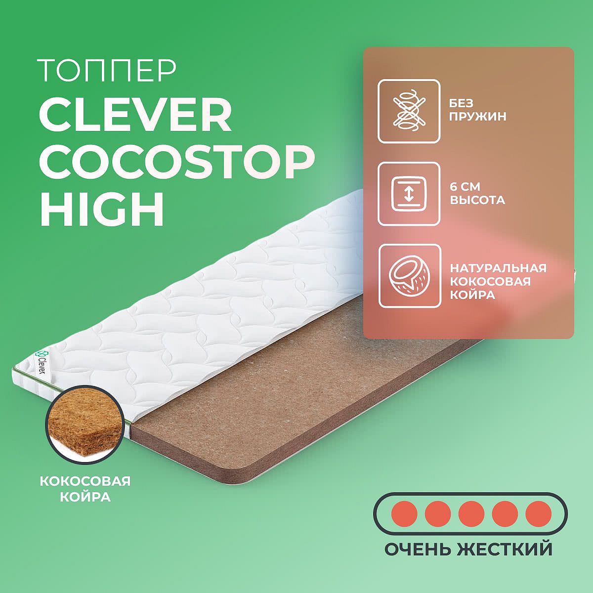 Топпер Clever CocosTop High — это беспружинный матрас с очень высокой жесткостью, созданный для тех, кто ценит уверенную поддержку и ровное спальное место. Благодаря натуральной кокосовой койре толщиной 6 см, топпер помогает выровнять поверхность любого дивана или кровати, делая сон более комфортным и спокойным. Такой топпер особенно подойдет для тех, кто предпочитает спать на жесткой поверхности или хочет усилить поддержку для спины. Чехол выполнен из прочного синтетического жаккарда, простеганного на синтепоне (100 г/м2), что придает изделию аккуратный внешний вид и дополнительную мягкость на ощупь. Высота топпера составляет 6 см — этого достаточно для заметного изменения ощущений на любом основании. Clever CocosTop High выпускается в трех вариантах крепления: без креплений, с резинками по углам или с липучками для удобства размещения на раскладушках и диванах. Доступно несколько расцветок, что позволяет подобрать подходящий вариант для вашего интерьера. Ключевые особенности