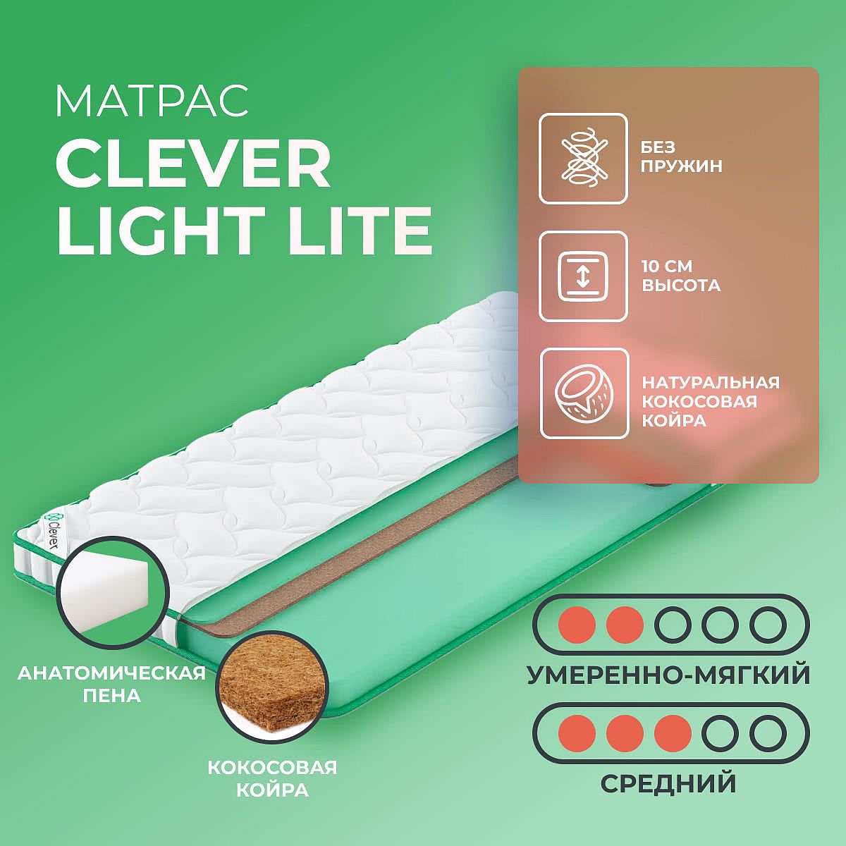 Матрас Clever Light Lite — это беспружинная модель из коллекции Twist, созданная для ежедневного комфортного сна. Две рабочие стороны с разной жесткостью позволяют выбрать подходящий уровень поддержки: средний или умеренно мягкий. Такой матрас подойдет тем, кто ищет универсальное решение для сна и предпочитает сочетание умеренной поддержки и мягкости. В основе конструкции — комбинация анатомической пены (ППУ) и натуральной кокосовой койры. Слой кокоса обеспечивает дополнительную упругость и долговечность, а пенополиуретан поддерживает тело и дарит приятные ощущения во время отдыха. Чехол выполнен из прочного синтетического жаккарда, простеганного на синтепоне для мягкости и аккуратного внешнего вида. Ключевые особенности