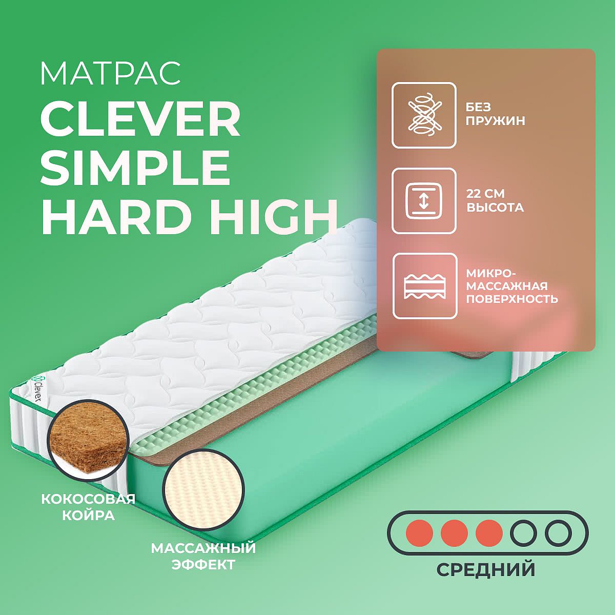 Матрас Clever Simple Hard High — это современный беспружинный матрас с двумя рабочими сторонами средней жесткости. Он обеспечивает ровную и устойчивую поддержку, подходящую для ежедневного сна и отдыха. Высота матраса составляет 22 см, что позволяет использовать его на большинстве кроватей стандартной и увеличенной высоты. Матрас выполнен в аккуратном дизайне с жаккардовым чехлом, простеганным на синтепоне, что делает поверхность приятной на ощупь. Основу конструкции составляет сочетание современных материалов: на одной стороне расположен слой конволюторного ППУ (2,5 см) и кокосовая койра (1 см) для дополнительной упругости, а в основании — плотный слой ППУ (18 см), который обеспечивает комфортное и стабильное положение тела во время сна. Благодаря отсутствию пружин матрас не передаёт вибраций и подходит для тех, кто ценит тишину и спокойствие ночью. Кокосовая койра добавляет матрасу умеренную жёсткость и способствует правильному распределению нагрузки. Максимально допустимый вес на спальное место — 110 кг. Ключевые особенности