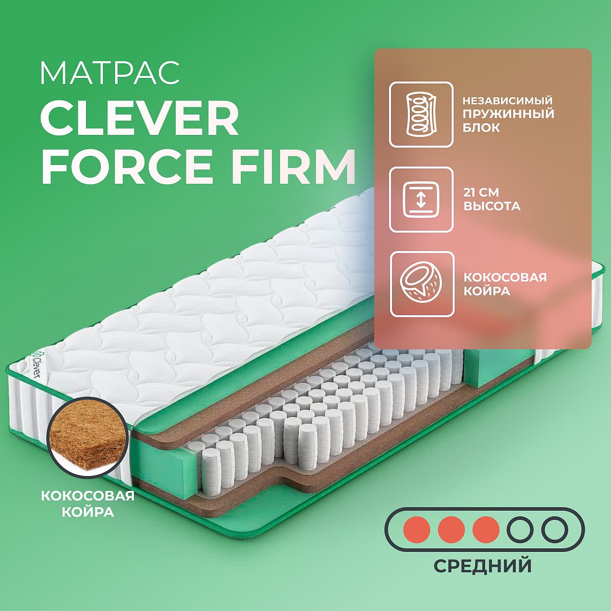 Матрас «Clever Force Firm» — средней жесткости, которая комфортна большинству людей среднего телосложения. Это — оптимальный выбор и детям, и взрослым, и пожилым людям.