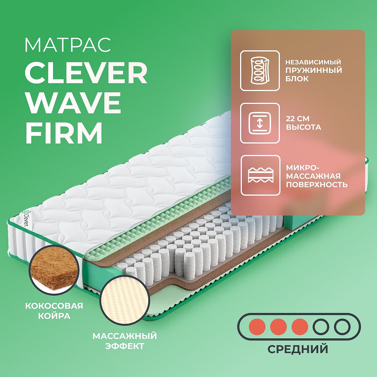Матрас «Clever Wave Firm» — средней жесткости, которая подходит большинству людей среднего телосложения. Это — оптимальный вариант и детям, и взрослым, и пожилым людям.