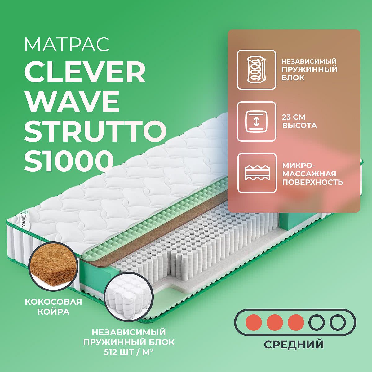 Матрас «Clever Wave Strutto S1000» — средней жесткости, которая комфортна большинству людей среднего телосложения. Это — оптимальный вариант и детям, и взрослым, и пожилым людям.