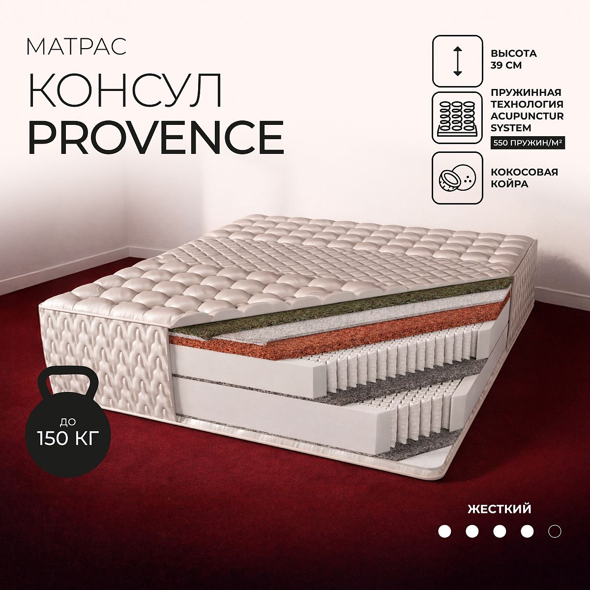 Кокос — натуральный материал, койра отлично дышит, придает матрасу «Provence» жесткость и упругость.
