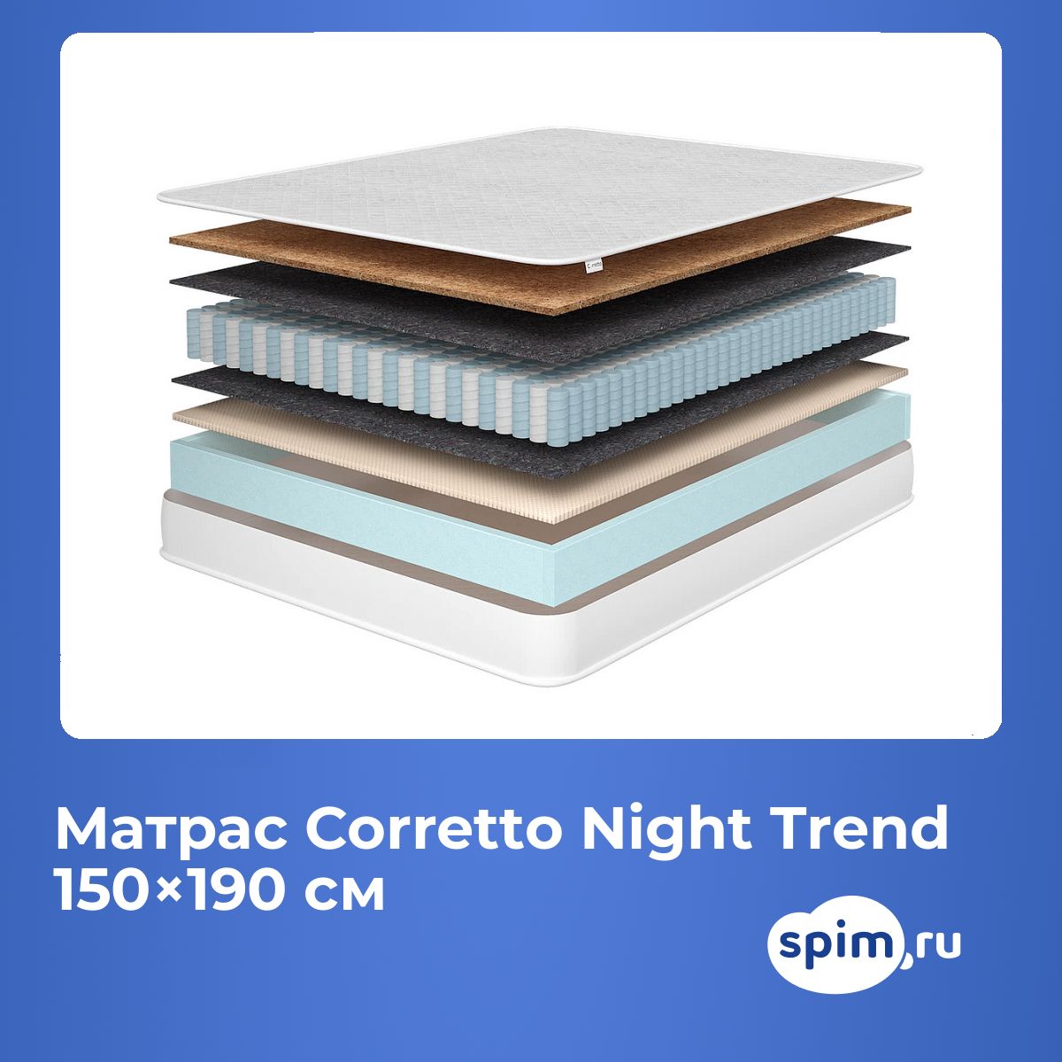 Двуспальный матрас Corretto Night Trend 150х190 подойдет для кроватей с размерами спального места, обозначенными как 150x190 см, 1500х1900 мм, 190х150 см, 1900х1500 мм (ширина 150 см, длина 190 см).