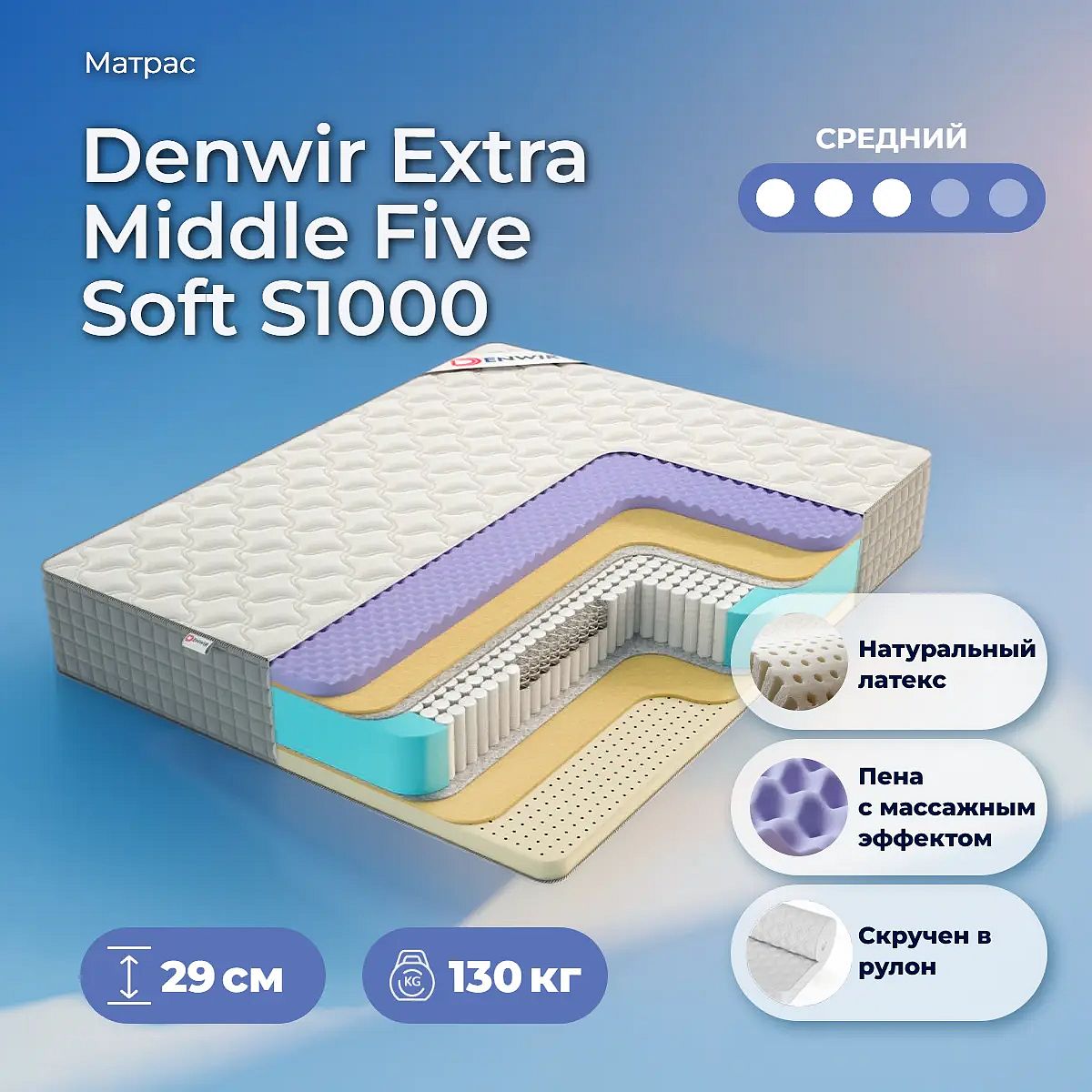 Матрас «Denwir Extra Middle Five Soft S1000» — средней жесткости, которая комфортна большинству людей среднего телосложения. Это — универсальный вариант и детям, и взрослым, и пожилым людям.