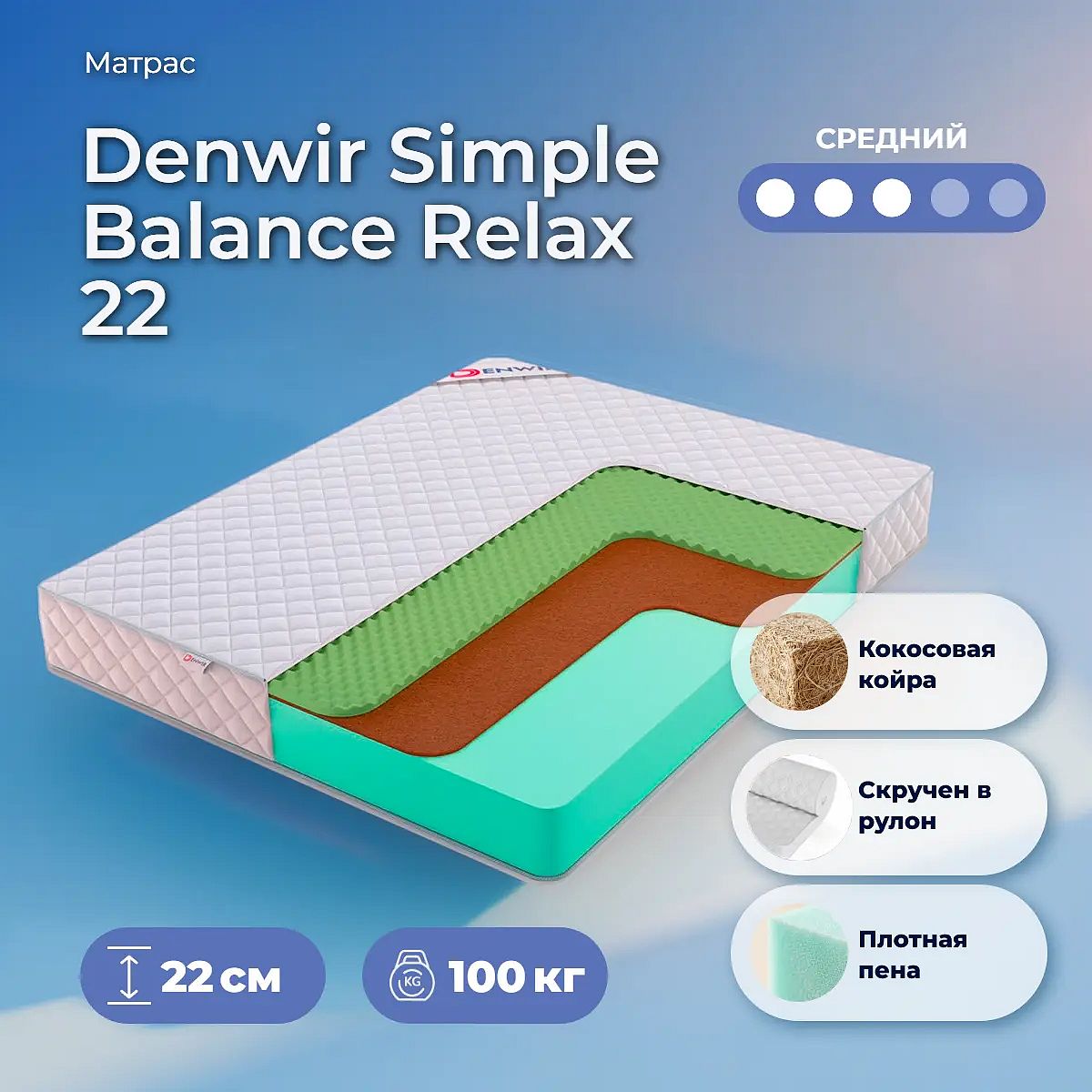 Матрас «Denwir Simple Balance Relax 22» — средней жесткости, которая подходит большинству людей среднего телосложения. Это — оптимальный выбор и детям, и взрослым, и пожилым людям.