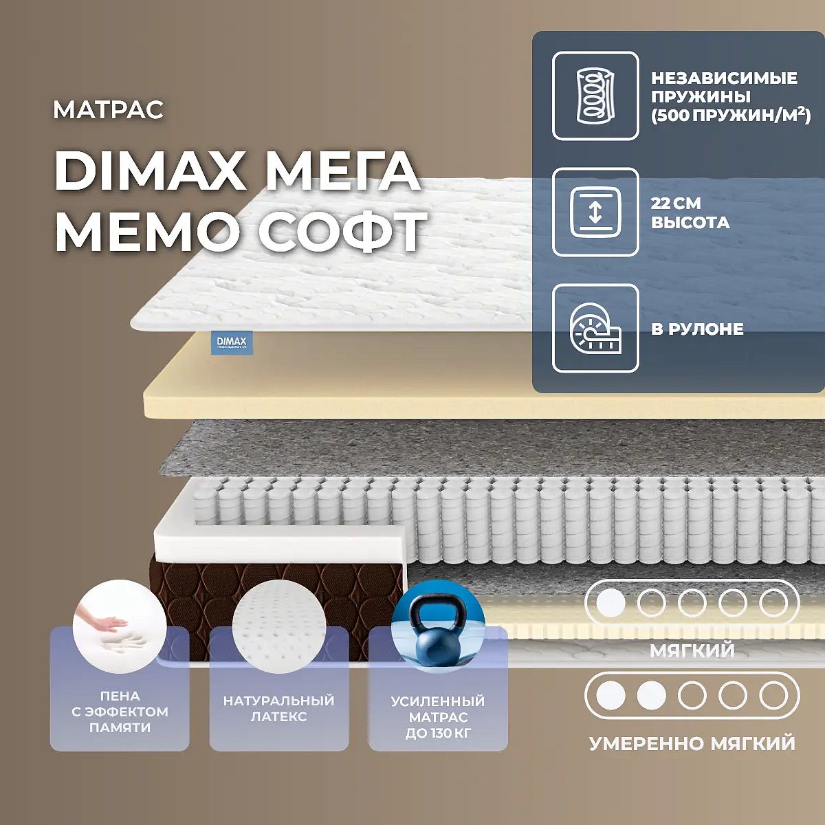 Уровень жесткости: низкий. Действие пружин S1000Основу модели Мега Мемо Софт составляет пружинный блок с высоким анатомическим эффектом. Такая конструкция обеспечивает телу полноценный отдых и подарит спокойный и ровный сон. Такой блок составлен 1000 пружин по 500 на 1 кв. метр. Пружины упакованы в отдельные чехлы из спанбонда и действуют автономно, никак не соприкасаясь друг с другом. Пружины имеют одинаковое строение и длину проволоки, прочная ткань чехла препятствует их выпиранию и деформации. Кроме того, конструкция очень прочная, она не прогибается, так как пружины работают только тогда, когда на них непосредственно направлена нагрузка. Такой пружинный блок способен выдерживать большие нагрузки. По периметру блок усилен слоем пенополиуретана.Наполнение моделиМодель двусторонняя: с одной стороны проложен слой материала с эффектом памяти формы, с другой – слой натурального латекса. Оба материала очень комфортные и эластичные. Латекс расслабляет, нежно обволакивает тело и снимает напряжение и стресс. Мемориформ способствует максимальному расслаблению, устраняет болевые ощущения в различных точках тела и восстанавливает кровоток. А также материал обладает интересной особенностью: он способен запоминать, затем повторять все контуры тела спящего. Оба материала гипоаллергенные и не имеют запаха.Чехол из трикотажаЧехол выполнен из мягких и приятных на ощупь тканей контрастных оттенков, что придаёт модели стильный и современный вид.Пласть чехла (спальные стороны) сшита из светло-кремового трикотажа и получила объемную стежку, выполненную по двум наполнителям – ППУ и холлкону, что обеспечивает дополнительный комфорт и мягкость поверхности для сна. Бурлет (боковая часть) изготовлен из мебельной ткани темно-коричневого цвета и простеган по ППУ. Материал не только защищает боковые части матраса от износа, но и дополняет общий дизайн чехла, создавая единый стильный образ. Обивка выступает надежной защитой для матраса и при этом обладает высокой эстетической привлекательностью. Общая высота матраса составляет 22 см, рекомендованная нагрузка – до 130 кг на спальное место. Защита матрасаДля защиты поверхности от пятен от пролитых жидкостей, грязи и пыли рекомендуем купить дополнительно защитный чехол или водонепроницаемый наматрасник.Другие моделиПосмотрите также другие модели этой серии: Dimax Мега Софт Люкс, Dimax Мега Мемо.Скрутка в рулонПо умолчанию матрас поставляется в развернутом виде. По вашему желанию матрас может быть доставлен в скрученном виде.При доставке транспортной компанией матрас всегда скручивается в рулон. Хранение матрасов в скрутке должно осуществляться: