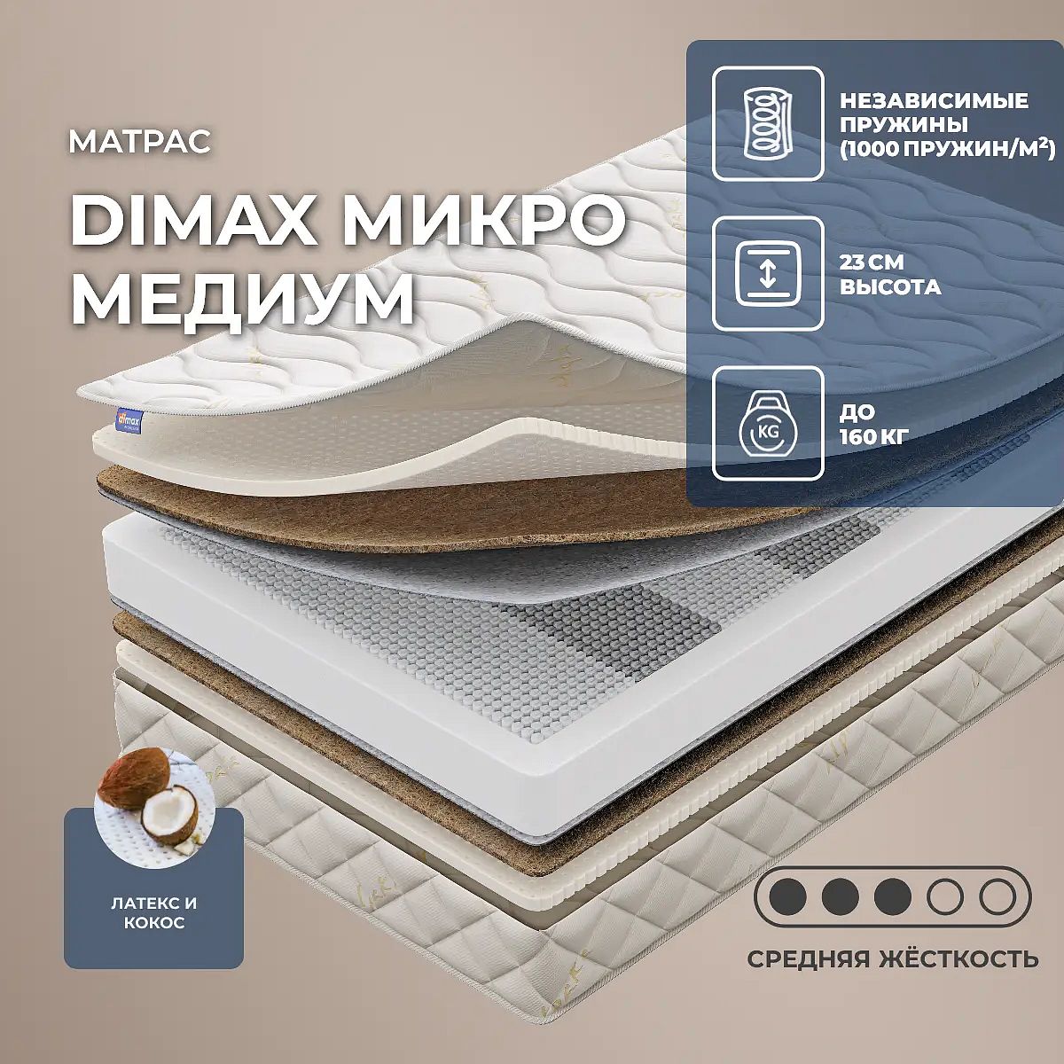 Уровень жесткости: средний. Нагрузка, кг: 160. Высота, см: 23. Действие пружин S2000Основа этой модели – это блок микропружин S2000. Входящие в его состав пружины имеют небольшой диаметр и длину проволоки. Они помещены в отдельные чехлы из прочного материала и действуют автономно. Это позволяет распределять нагрузку равномерно по всей поверхности. Такой пружинный блок способен выдерживать большие нагрузки.Сочетание кокоса и латексаПо обеим сторонам проложены слои натурального латекса и кокосовой койры. Материал природный и абсолютно безопасный для здоровья и сна спящего. Кокос объединяет спрессованные друг с другом сухие волокна, которые пропитывают соком латекса для большей их эластичности. Кокос обеспечивает поддержку для позвоночника и всего тела в целом, расслабляет и создает благоприятный микроклимат на поверхности. Натуральный латекс - это млечный сок дерева Гевеи, он очень мягкий и обладает повышенной эластичностью и упругостью. Материал способен подстраиваться под тело спящего и создавать комфортную поверхность для полноценного сна.Чехол из трикотажаЧехол модели изготавливается из трикотажа с комфортным слоем.Защита матрасаДля защиты поверхности от пятен от пролитых жидкостей, грязи и пыли рекомендуем купить дополнительно защитный чехол или водонепроницаемый наматрасник.Другие моделиПосмотрите также другие модели этой серии: Dimax Микро Ультимэйт, Dimax Микро Медиум Хард.Матрас поставляется в полном размере. Скрутить этот матрас невозможно.