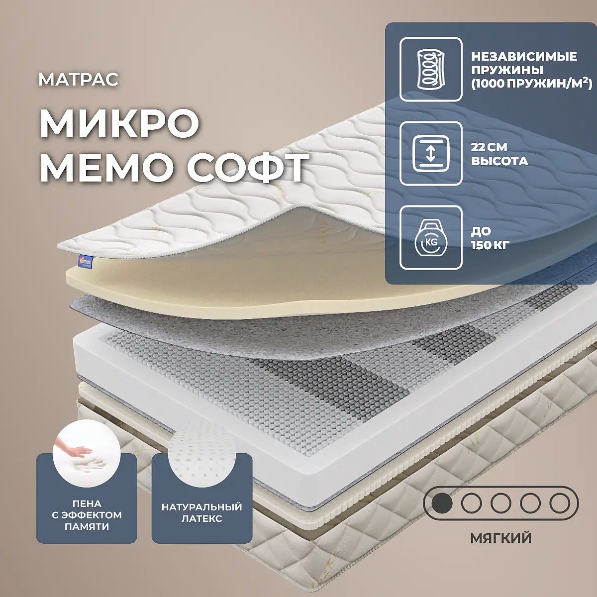 О материалахНатуральный латекс — природный материал из вспененного сока гевеи, отличается высокой эластичностью, мягкостью и долговечностью. Он способствует хорошей вентиляции и создаёт комфортный микроклимат для сна. Пена с эффектом памяти (мемориформ) — инновационный материал, который подстраивается под форму тела, равномерно распределяет давление и способствует глубокому расслаблению мышц. Советы по уходуЧехол матраса несъёмный — рекомендуется сухая чистка. Для сохранения чистоты и продления срока службы используйте защитный наматрасник (не входит в комплект). О производителеDimax — российский бренд с собственным производством, специализирующийся на создании современных матрасов на независимых пружинах и с инновационными наполнителями. Компания уделяет особое внимание качеству материалов и контролю на всех этапах производства.