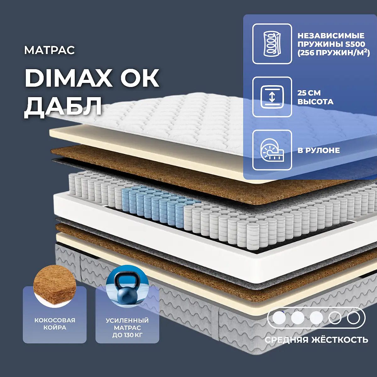 Матрас Dimax Ок Дабл — современный пружинный матрас, сочетающий выверенный баланс комфорта, поддержки и долговечности. Высота 25 см и тщательно продуманный состав слоёв обеспечивают уверенную поддержку тела, приятную упругость и комфорт для сна каждый день. Обе стороны матраса — с разной структурой, но одинаково подходят для тех, кто ценит умеренно-жёсткую основу и мягкую адаптивность верхних слоёв. В основе — 5-зонный блок независимых пружин (256 пружин/м2), каждая из которых работает отдельно, равномерно распределяя нагрузку и поддерживая правильное положение позвоночника. Слои искусственного латекса (по 3 см с каждой стороны) придают поверхности эластичность и мягкость, а кокосовая койра (1 см и 2 см в разных слоях) отвечает за дополнительную жёсткость и вентиляцию. Термовойлок отделяет пружинный блок, повышая износостойкость матраса. Чехол матраса выполнен из приятного трикотажа с объёмной стёжкой на синтепоне и пене Balance — благодаря этому поверхность выглядит аккуратно и ощущается мягкой. Матрас выдерживает нагрузку до 130 кг на одно спальное место, подходит для сна в любых положениях. Поставляется скрученным в рулон — удобно для транспортировки и размещения в квартире. Характеристики