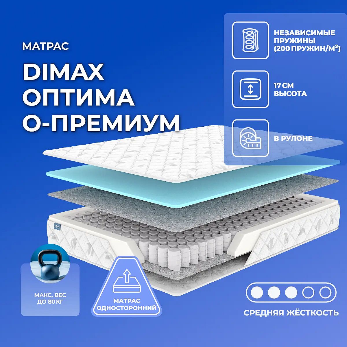 Матрас «Dimax Оптима О-Премиум» — средней жесткости, которая комфортна большинству людей среднего телосложения. Это — оптимальный вариант и детям, и взрослым, и пожилым людям.