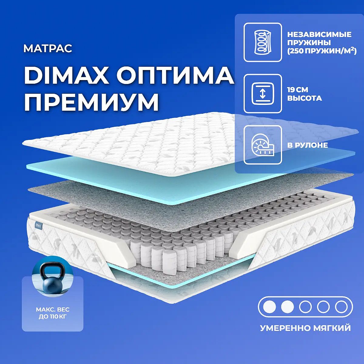 Матрас Dimax Оптима Премиум — это комфортный пружинный матрас на независимых пружинах, созданный для поддержания спокойного сна и расслабления. Его умеренно мягкая жесткость подойдет тем, кто ценит деликатную поддержку и приятные ощущения во время отдыха. Независимые пружины (до 250 шт/м2) равномерно распределяют вес тела и минимизируют передачу движений, что особенно важно для пар. Прочный войлок изолирует пружинный блок и обеспечивает ровную поверхность. Мягкий несъемный чехол из трикота, простеганный на синтепоне, добавляет уюта и аккуратно смотрится в спальне. Баланс между мягкостью и поддержкой достигается за счет использования эластичной пены Balance foam по обе стороны матраса. Высота матраса — 19 см, максимальная нагрузка на спальное место — до 110 кг. Матрас поставляется в скрученном виде для удобства транспортировки и хранения. Характеристики