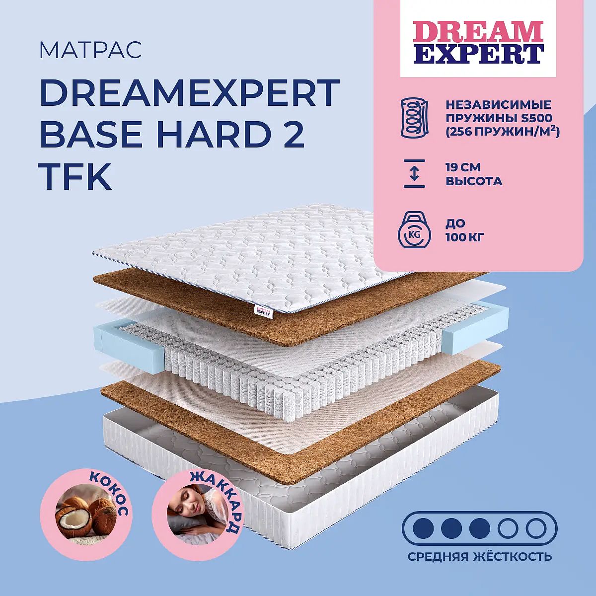 Матрас DreamExpert Base Hard 2 TFK — это практичное решение для сна с комфортом и поддержкой. Сочетание средней и повышенной жесткости двух сторон позволяет подобрать подходящее ощущение для разных предпочтений. Высота 19 см делает матрас универсальным для большинства типов кроватей. Основу конструкции составляет блок независимых пружин S500 — 256 пружин на м2, благодаря чему нагрузка распределяется равномерно, а поддержка тела остается точечной, без эффекта «гамака». С обеих сторон используется слой кокосовой койры толщиной 20 мм, что придаёт матрасу необходимую упругость и долговечность. Ключевые особенности