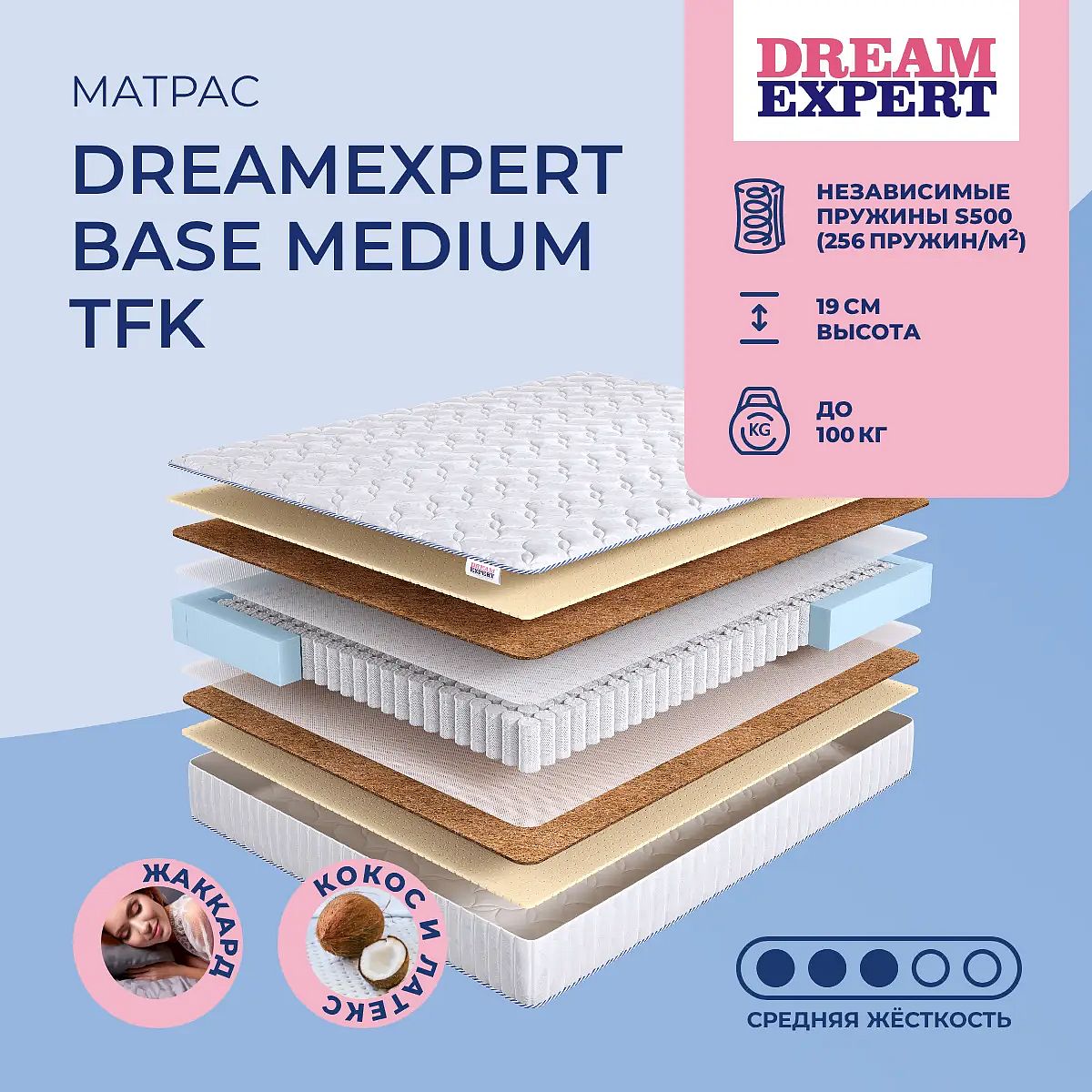 Матрас DreamExpert Base Medium TFK — это удобный пружинный матрас средней жёсткости для комфортного сна на каждый день. Благодаря симметричной конструкции обе стороны матраса обеспечивают одинаковые ощущения, что удобно для регулярного переворачивания и равномерного износа. Высота матраса — 19 см, он рассчитан на нагрузку до 100 кг на спальное место. В основе — блок независимых пружин S500 с плотностью 256 пружин на м2. Такой блок обеспечивает точечную поддержку тела и способствует правильному положению позвоночника во время отдыха. Слой натурального латекса (10 мм с каждой стороны) придаёт упругость, мягкость и адаптацию к контурам тела. Кокосовая койра (10 мм с каждой стороны) добавляет необходимую жёсткость и поддерживает долговечность матраса. Ключевые особенности