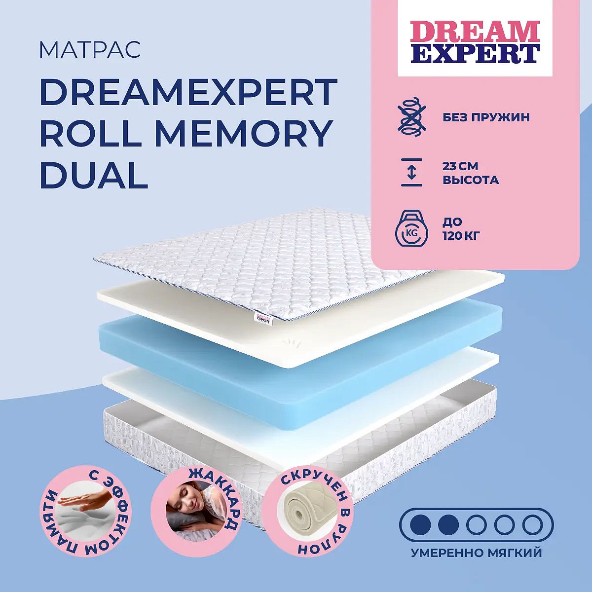 Матрас DreamExpert Roll Memory Dual — беспружинная модель для тех, кто ценит мягкость и заботится о качестве сна. Умеренно мягкая поддержка с обеих сторон обеспечивает расслабление мышц и способствует комфортному отдыху каждую ночь. Высота 23 см позволяет матрасу хорошо держать форму и создавать приятную, уютную посадку на кровати. В основе — сочетание двух слоёв материала с эффектом памяти Memory Foam (по 4 см с каждой стороны) и центрального слоя Flex Foam (14 см). Такой состав позволяет матрасу точно подстраиваться под контуры тела, мягко распределяя нагрузку и снижая давление на точки опоры. Матрас рассчитан на вес до 120 кг на одно спальное место и поставляется в скрученном виде для удобной транспортировки. Ключевые особенности