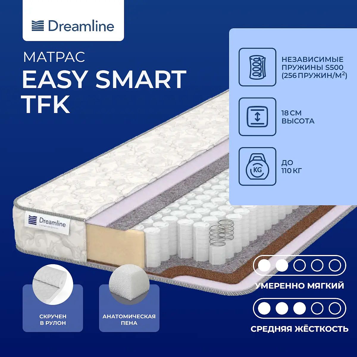 Практичная двусторонняя модель на основе блока независимых пружин. Состав матрасаОдна сторона выполнена из упругого искусственного латекса, другая – образована сочетанием искусственного латекса и материала Poly Refine.Материал Poly RefineЭто очень гибкий и прочный материал. Состоит из плотно спрессованных переработанных хлопковых и синтетических волокон. Благодаря этому он обладает высокой жесткостью. Материал гипоаллергенный, дышащий и не препятствует осуществлению влаго и воздухообмену в матрасе. Его плотность 1000 г/м2, он придает матрасу жесткости и эластичности, поэтому все модели матрасов с этим материалом становятся более износостойкими, что увеличивает срок службы самого матраса.Гибкий материалИскусственный латекс – популярный наполнитель, отличающийся особой прочностью и гибкостью. Он способен выдерживать большие нагрузки, а также обладает способностью принимать форму тела спящего.Центральная часть матрасаЦентр модели – независимый пружинный блок TFK. Здесь 500 микропружин помещены каждая в свой чехол из износостойкого материала. Пружины действуют, когда на них направлена нагрузка.Жаккардовый чехолПлотная жаккардовая ткань изготовлена из синтетических волокон. Благодаря пропитке чехол не подвержен истиранию и сминанию ткани в процессе его эксплуатации. Чехол гипоаллергенен и долговечен.Защита моделиЕсли вы заботитесь о чистоте своего спального места и продлить срок службы всего изделия, тогда рекомендуем купить защитный наматрасник-чехол или водонепроницаемый наматрасник.Скрутка в рулонПо умолчанию матрас поставляется в развернутом виде. По вашему желанию матрас может быть доставлен в скрученном виде.Другие моделиВы также можете посмотреть другие модели – Dreamline Easy Norma TFK, Dreamline Easy Feel TFK.