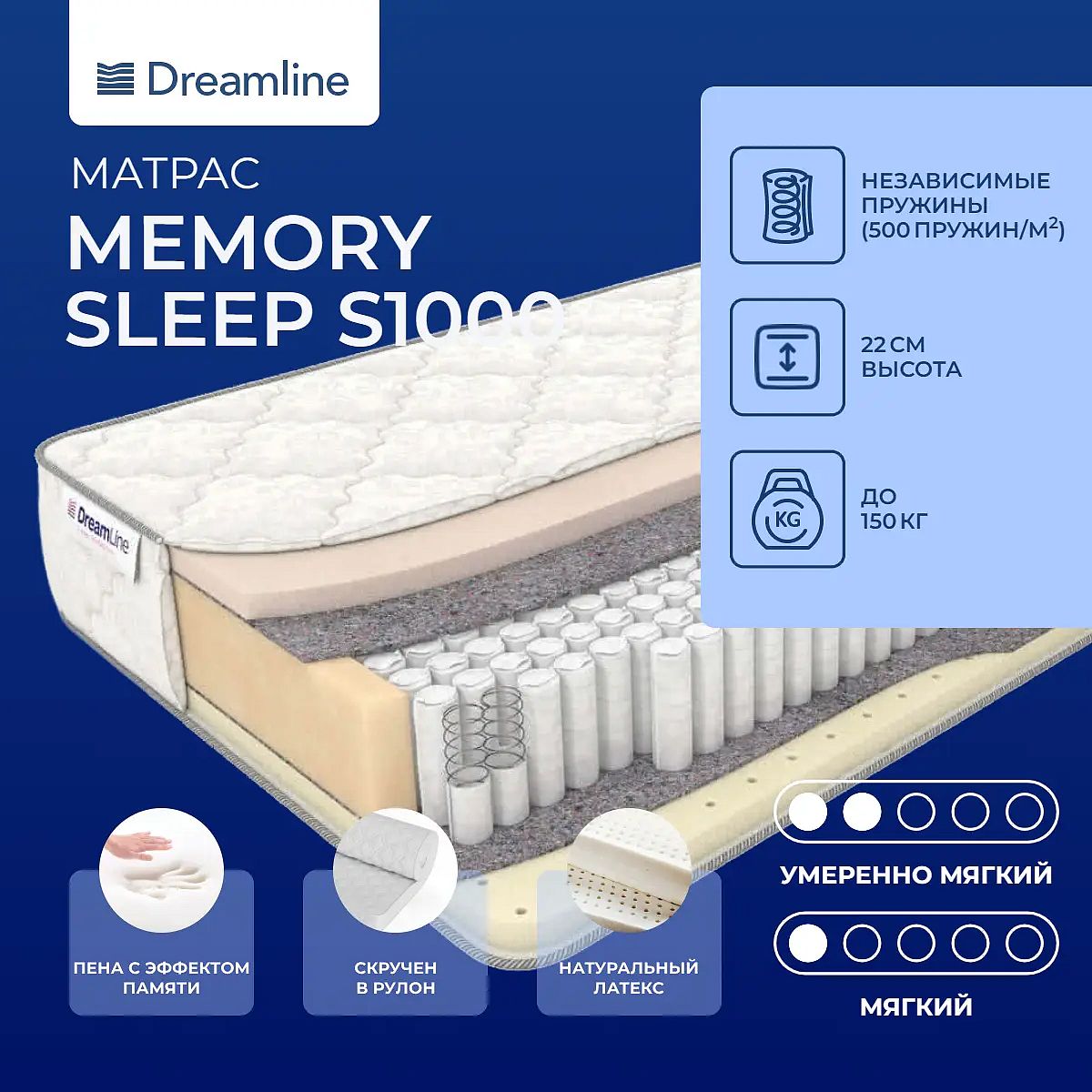 Высота, см: 22. Ограничение по максимальной нагрузке, кг: 150. Наполнение моделиЭта модель двусторонняя, одна сторона выполнена на основе слоя натурального латекса, а другая на основе материала с эффектом памяти формы. Латекс мягкий, он обладает способностью подстраиваться под все изгибы тела и принимать их. Он максимально расслабляет и снимает напряжение в мышцах и суставах. Материал гипоаллергенный и гигиеничный, он способен создавать благоприятный микроклимат на поверхности. Другая сторона модели выполнена на основе слоя материала, обладающего эффектом памяти формы. Он также мягкий, способен принимать форму тела спящего и запоминать ее, а потом повторять на своей поверхности под действием температуры тела и давления от него. Материал эластичный и упругий, он способствует релаксации и снятию болевых ощущений в различных частях тела.Особенности работы пружин S1000В основе модели проложен анатомический пружинный блок S1000. В нем находится 1000 одинаковых микропружин, по 500 на 1 кв. метр. Пружины отделены друг от друга и помещены в отдельные чехлы из прочной ткани. Они работают автономно, никак не задевают соседние. Когда человек присаживается на такой блок, то прогибаются только те пружины, на которые направлена нагрузка.Жаккардовый чехолЧехол модели выполнен из хлопкового жаккарда Elite и простеган на холлконе.Защита матрасаДля защиты от загрязнений, нежелательных пятен рекомендуем купить защитный наматрасник или водонепроницаемый чехол. Он сохранит поверхность чистой, а также продлит срок службы матраса.Скрутка в рулонПо умолчанию матрас поставляется в развернутом виде. По вашему желанию матрас может быть доставлен в скрученном виде.Другие моделиТакже вы можете посмотреть другую модель на блоке S1000 - Dreamline Memory Dream S1000.