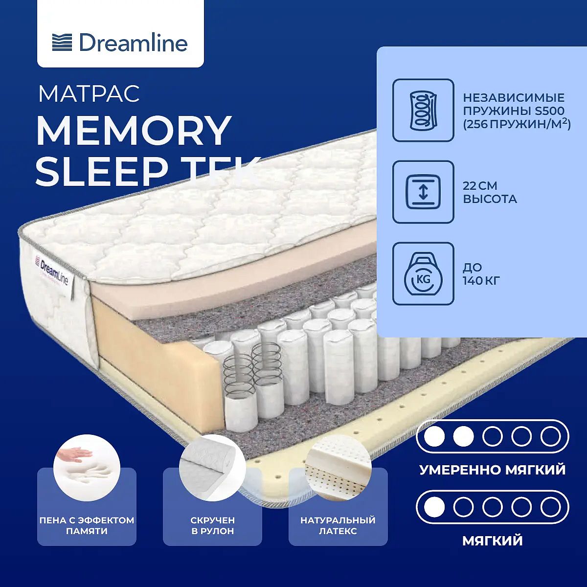 Высота, см: 22. Ограничение по максимальной нагрузке, кг: 140. Особенности работы пружин TFKОсновой модели служит пружинный блок TFK. В нем по 256 микропружин расположены на 1 кв. метре поверхности и каждая пружина помещена в отдельный чехол из прочной и износостойкой ткани. Пружины изолированы друг от друга и поэтому действуют самостоятельно. Прогибаются только те пружины, на которые идет давление. Это обеспечивает равномерное распределение нагрузки по всему блоку и способствует комфортному сну.Наполнение моделиС одной стороны модели проложен наполнитель с эффектом памяти формы. Это уникальный материал искусственного происхождения. Он мягкий, имеет способность подстраиваться под всей изгибы тела и повторять их в отсутствии нагрузки. Материал хорошо проводит воздух и создает оптимальный микроклимат на поверхности. С другой стороны лежит слой натурального латекса и это еще более мягкая сторона. Латекс обладает способностью подстраиваться и повторять все изгибы тела, максимально расслабляя его и погружая в невероятную комфортную поверхность. Латекс снимает мышечное напряжение и убирает болевые ощущения в различных точках тела. Оба материала абсолютно безопасны для здоровья.Жаккардовый чехолЧехол модели выполнен из хлопкового жаккарда Elite и простеган на холлконе.Защита матрасаДля защиты от загрязнений, нежелательных пятен рекомендуем купить защитный наматрасник или водонепроницаемый чехол. Он сохранит поверхность чистой, а также продлит срок службы матраса.Скрутка в рулонПо умолчанию матрас поставляется в развернутом виде. По вашему желанию матрас может быть доставлен в скрученном виде.Другие моделиТакже вы можете посмотреть другие модели этой серии: Dreamline Memory Dream TFK, Dreamline Memory Sleep S1000.