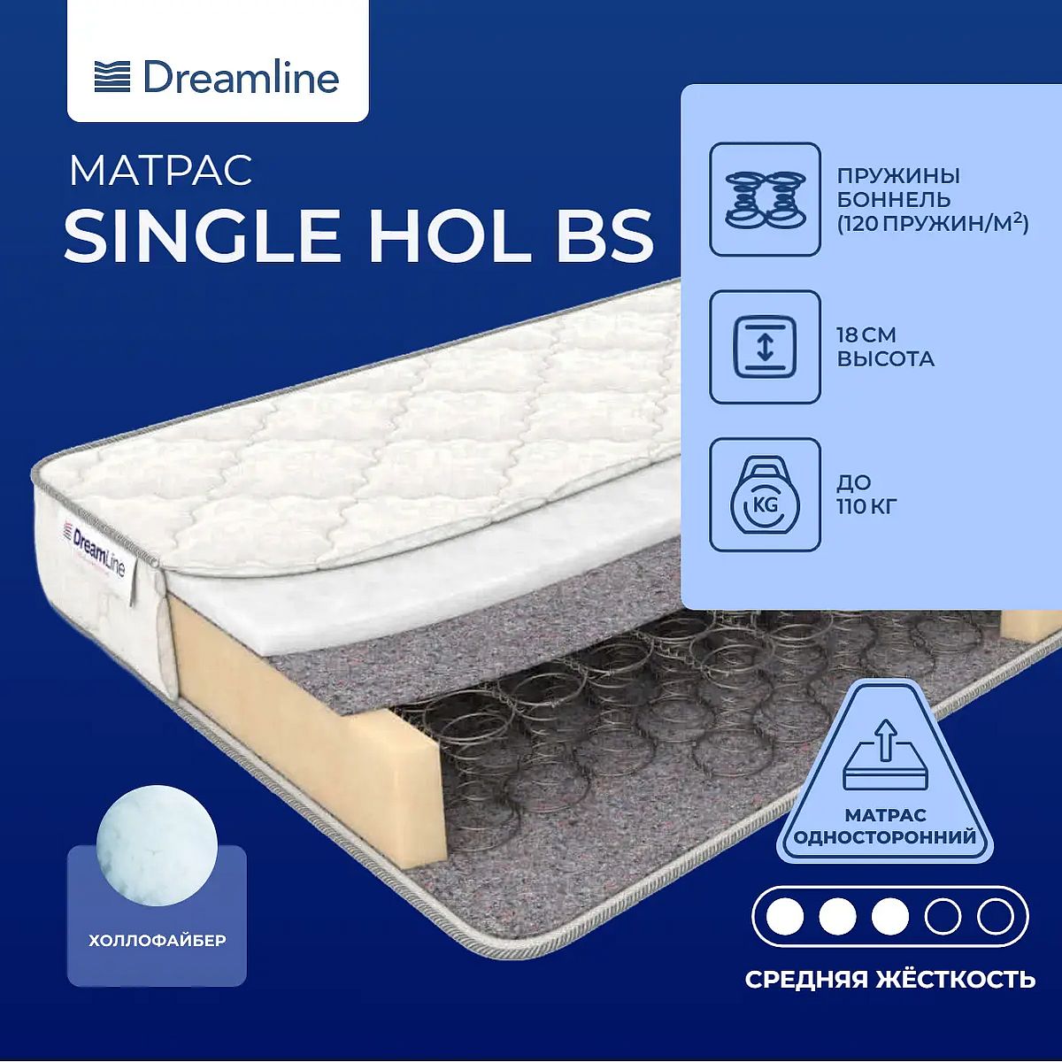 Умеренно-жесткая модель с холлофайбером на блоке «Боннель». Зависимый пружинный блокКонструкция блока зависимого типа, то есть пружины крепятся одна к другой и скручиваются определенным образом, образуя спирали. Они изготавливаются из прочного металла, присоединяются к каркасу при помощи металлической проволоки. Такой пружинный блок очень надежный. С обеих сторон блок прикрыт слоями термовойлока. Он служит изолирующим слоем между блоком и слоями матраса, препятствует выпадению пружин, а также выравнивает поверхность.Жесткий холлофайберСпальная сторона выполнена из холлофайбера. Это материал искусственного происхождения, он изготавливается из большого количества спиралевидных волокон. Они переплетаются очень плотно, поэтому и весь материал плотный и износостойкий.Хлопковый чехолЧехол изготавливается из хлопкового жаккарда, простеганного на холлконе. Он плотный и износостойкий.Защита матрасаДля защиты матраса от загрязнений, пыли и влаги купите дополнительно защитный наматрасник-чехол или водонепроницаемый наматрасник.Другие моделиВы можете посмотреть аналогичную модель с кокосом – Dreamline Single Hol Hard Bonnel. А также модель помягче - Dreamline Single Foam Hard Bonnel.