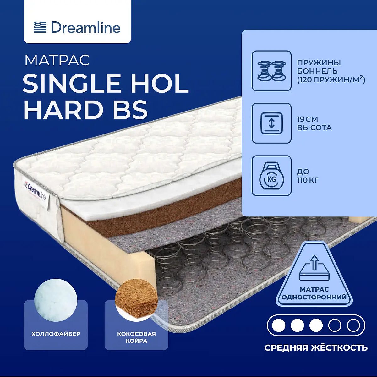 Модель умеренно-жесткая с кокосом и холлофайбером на пружинах «Боннель». Спальная сторона матрасаСпальная сторона выполнена из сочетания кокоса и холлофайбера. Кокос – природный жесткий наполнитель. Он служит хорошей опорой позвоночнику, а также поддерживает всю конструкцию в целом. Холлофайбер – умеренно-жесткий материал искусственного происхождения, благодаря переплетениям спиралевидных волокон он очень прочный и износостойкий.Прочные пружиныОснову блока «Боннель» составляют скрученные друг с другом пружины из прочного металла. Каркас также составляет основа из прочного материала. Благодаря этому сам блок очень надежный, выдерживает большие нагрузки. С обеих сторон блок поддерживается слоем из износостойкого и плотного термовойлока.Чехол из жаккардаЧехол изготавливается из хлопкового жаккарда, простеганного на холлконе. Ткань чехла плотная и приятная на ощупь.Защита матрасаДля защиты матраса от загрязнений, пыли и влаги купите дополнительно защитный наматрасник-чехол или водонепроницаемый наматрасник.Другие моделиВы можете посмотреть модель помягче – Dreamline Single Foam Hard Bonnel. А также модель c холлофайбером и ППУ - Dreamline Single Hol Bonnel.