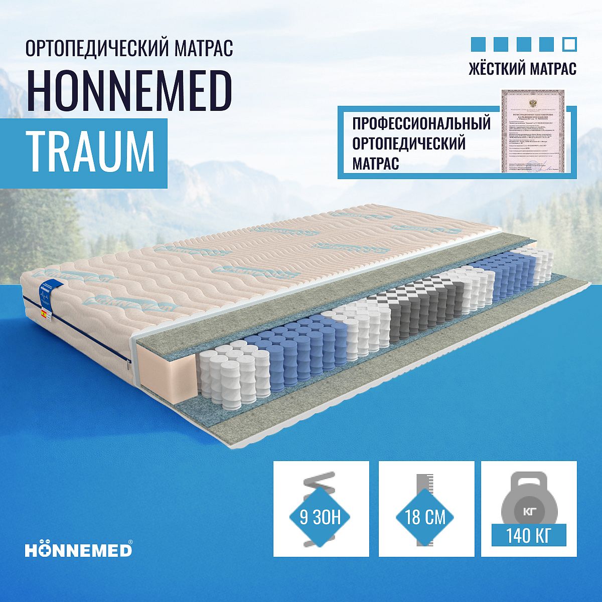 Ортопедические свойства матраса «ортопедический матрас Honnemed Traum» подтверждены — матрас сертифицирован как медицинское изделие. Матрас будет полезен для правильной поддержки позвоночника и профилактики нарушений опорно-двигательного аппарата.