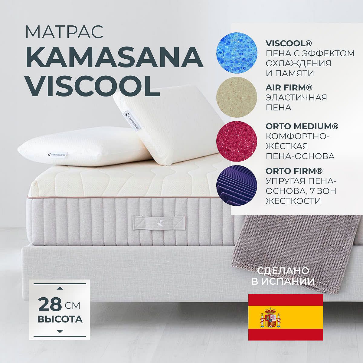 Матрас «Kamasana Viscool» — средней жесткости, которая подходит большинству людей среднего телосложения. Это — универсальный выбор и детям, и взрослым, и пожилым людям.