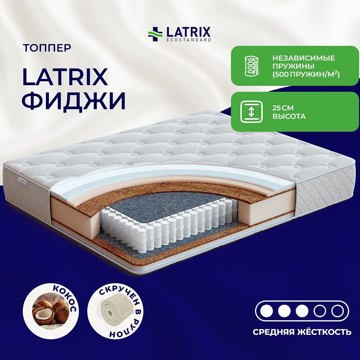 Матрас «Latrix Фиджи» — средней жесткости, которая комфортна большинству людей среднего телосложения. Это — оптимальный выбор и детям, и взрослым, и пожилым людям.