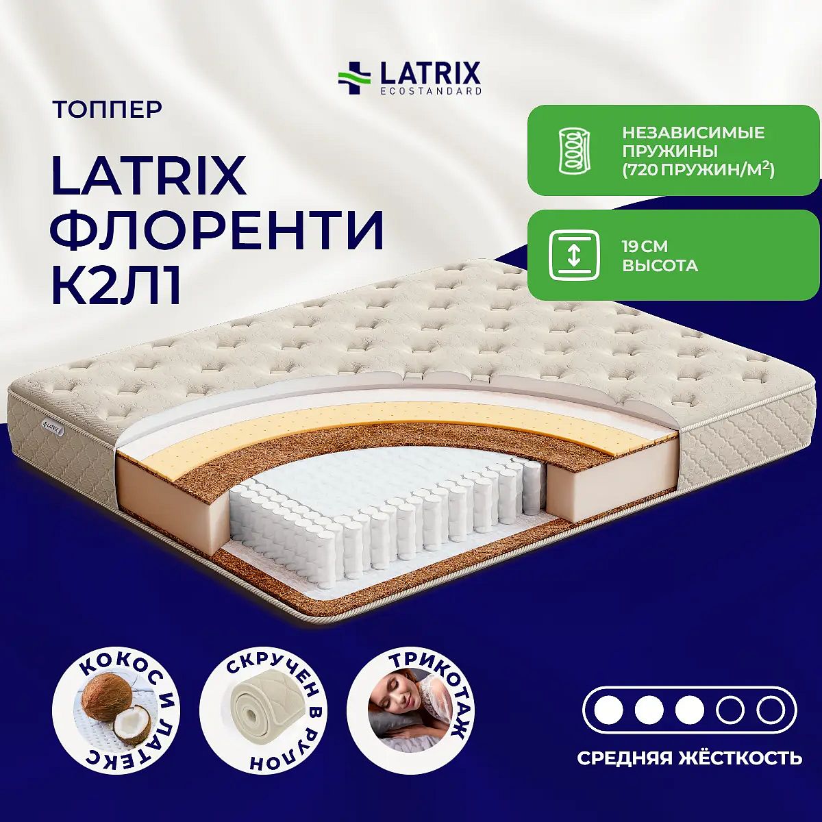 Ìàòðàñ «Latrix Ôëîðåíòè Ê2Ë1» — ñðåäíåé æåñòêîñòè, êîòîðàÿ ïîäõîäèò áîëüøèíñòâó ëþäåé ñðåäíåãî òåëîñëîæåíèÿ. Ýòî — óíèâåðñàëüíûé âûáîð è äåòÿì, è âçðîñëûì, è ïîæèëûì ëþäÿì.