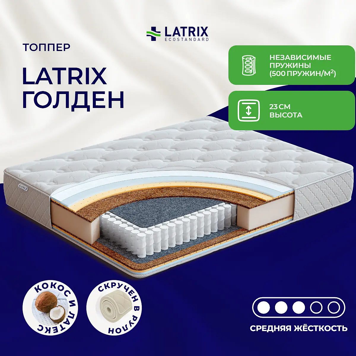 Матрас «Latrix Голден» — средней жесткости, которая подходит большинству людей среднего телосложения. Это — оптимальный выбор и детям, и взрослым, и пожилым людям.