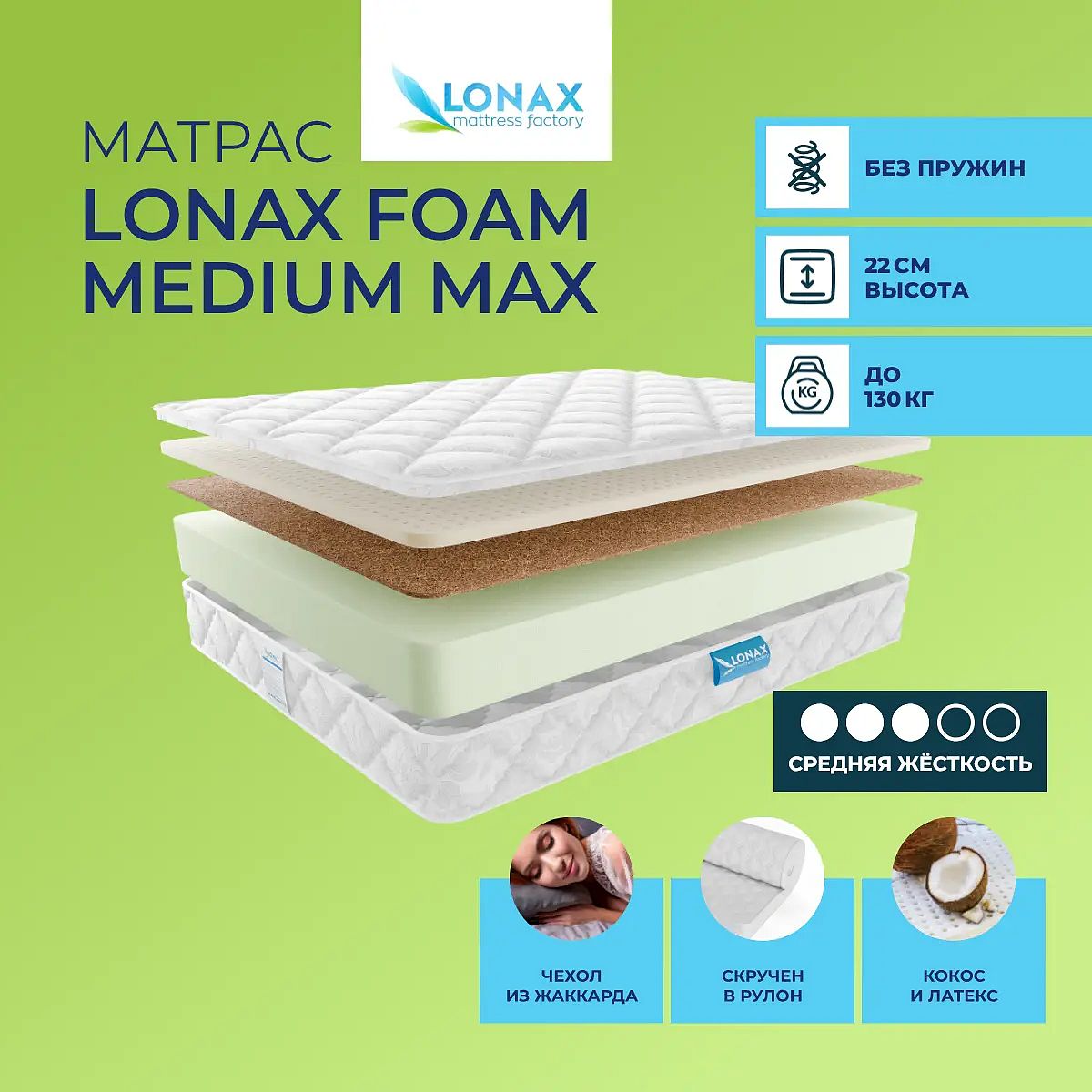 Матрас Lonax Foam Medium Max – это беспружинная модель с разными по составу сторонами и комфортной средней жесткостью. Такая конструкция обеспечивает универсальную поддержку и приятные ощущения во время сна. Высота 22 см позволяет использовать матрас на кроватях с различной глубиной посадки, а максимальная нагрузка на спальное место составляет 130 кг. С одной стороны используется комбинация натурального латекса (3 см) и кокосовой койры (1 см) — это придаёт матрасу упругость, делает его приятным на ощупь и поддерживает правильное положение тела во время отдыха. Вторая сторона выполнена из пенополиуретана (18 см) — материал хорошо пропускает воздух и сохраняет форму при длительном использовании. Характеристики