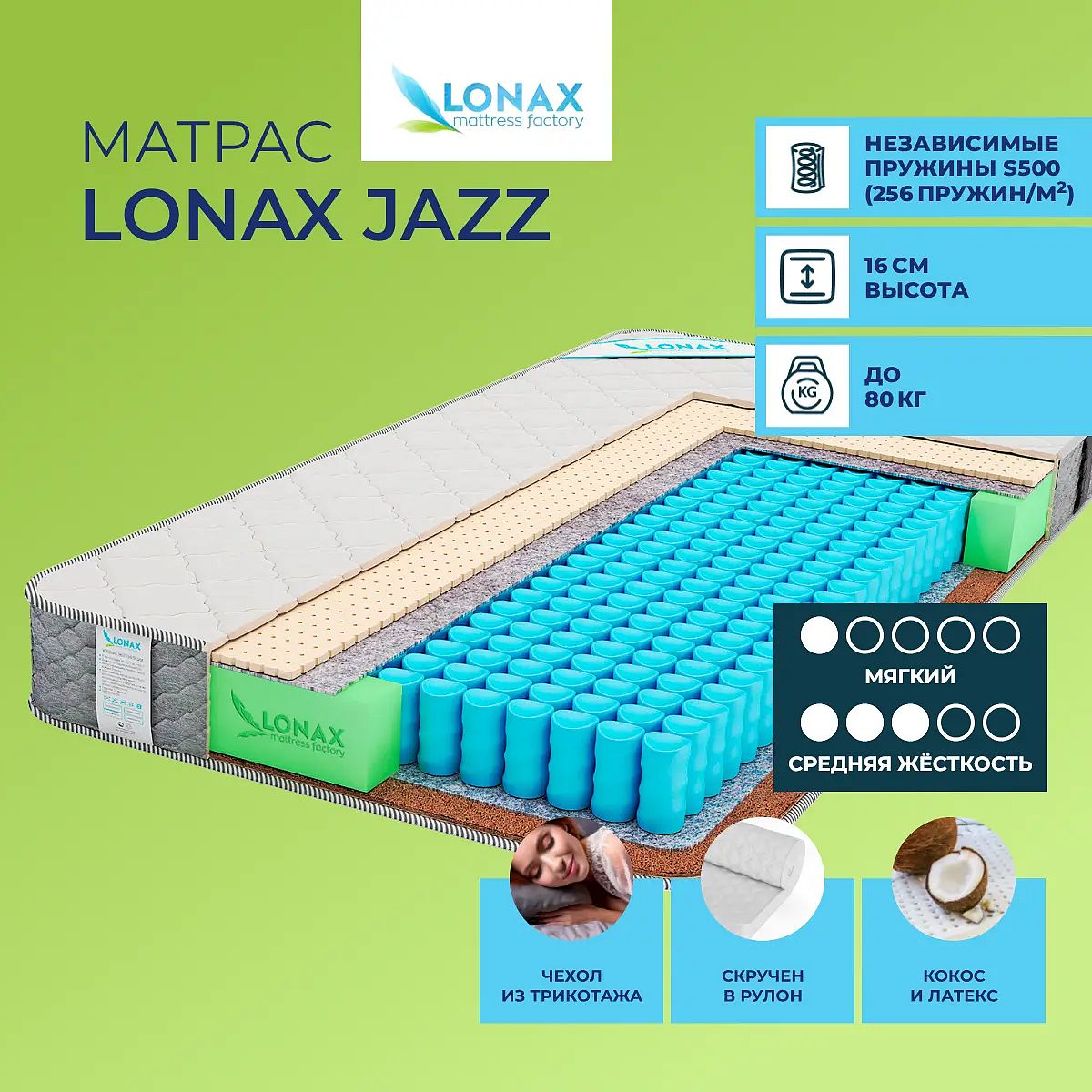 Матрас Lonax Jazz с разной жесткостью сторон из серии Light – это недорогой вариант матраса, в базе которого используется пружинный блок – TFK.Уровень жесткости: низкий/средний. Состав: