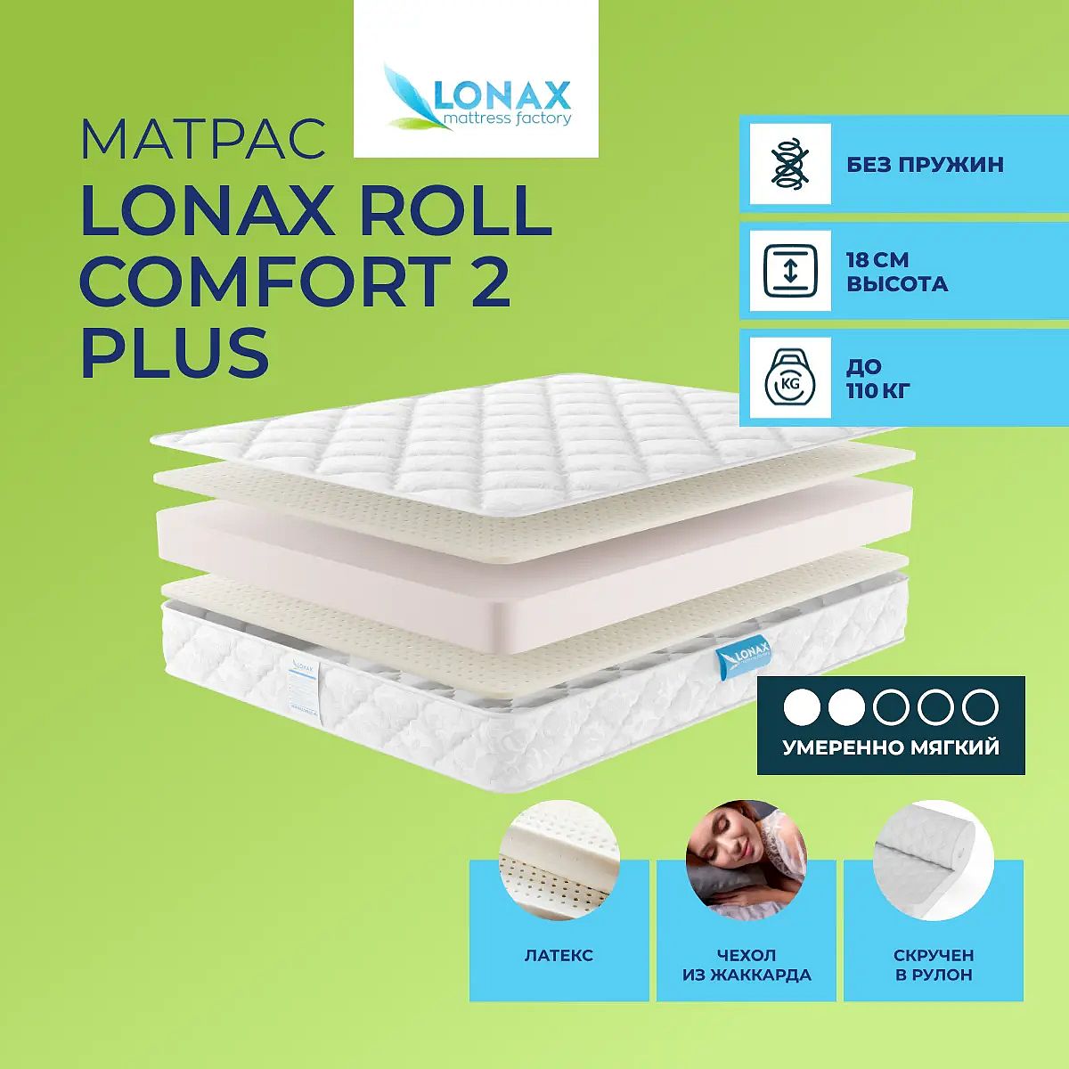 Средне-мягкий матрас «Lonax Roll Comfort 2 Plus» просто создан для настоящего ценителя комфорта. Такая модель отлично подходит людям с небольшим весом.