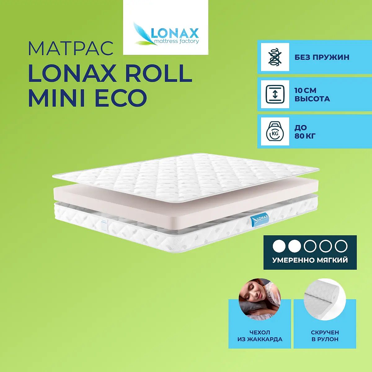 Средне-мягкий матрас «Lonax Roll Mini Eco» — для истинного ценителя комфорта. Такая модель отлично подойдет людям с небольшим весом.