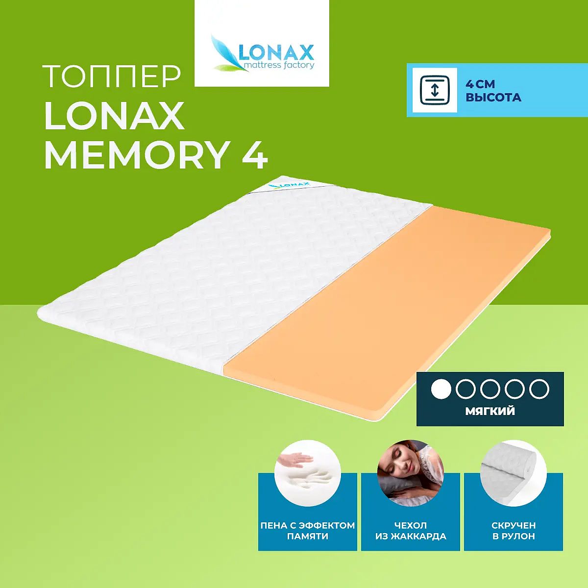 Топпер Lonax Memory 4 — это мягкий беспружинный матрас-топпер, который помогает сделать поверхность для сна на диване или кровати более комфортной. Благодаря слою материала Мемориформ (4 см) топпер мягко подстраивается под контуры тела, снижая точечное давление и обеспечивая ощущение невесомости во время отдыха. Идеально подходит для ежедневного использования на диванах и кроватях, когда требуется повысить комфорт сна без покупки нового матраса. Съемный чехол выполнен из прочного жаккарда с простежкой на синтепоне, что придает изделию аккуратный внешний вид и продлевает срок службы. Чехол легко снять для чистки благодаря наличию молнии. Для фиксации топпера можно выбрать резинки или липучки по углам — это удобно для различных сценариев использования, в том числе на диванах с раскладным механизмом. Характеристики