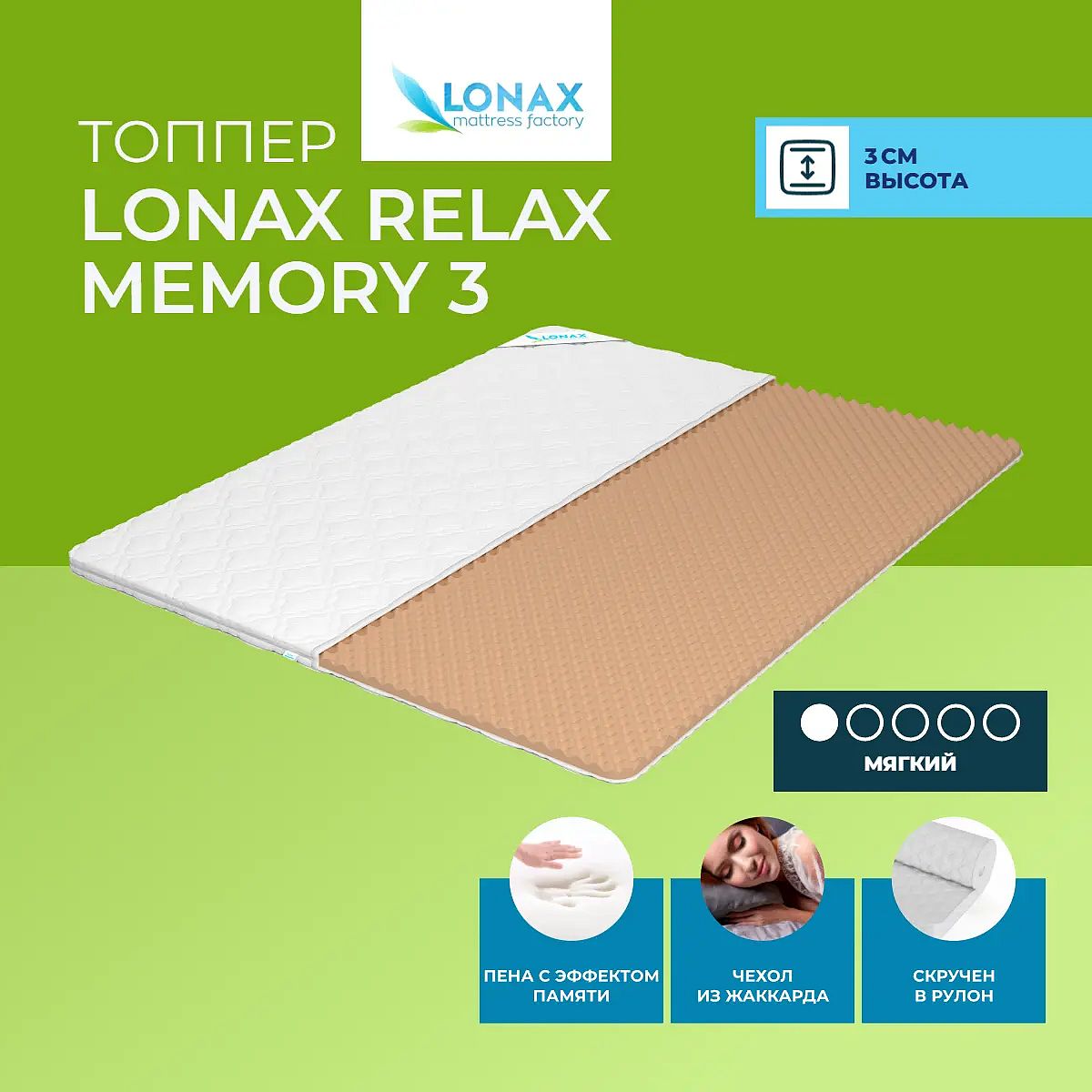 Тонкий матрас-топпер Lonax Relax Memory 3 — это мягкое и комфортное решение для улучшения качества сна. Благодаря слою мемориформ высотой 3 см топпер бережно подстраивается под контуры тела, создавая ощущение невесомости и снижая давление на поверхности. Такой матрас особенно хорошо подходит для тех, кто предпочитает мягкую поддержку и стремится сделать спальное место более уютным и удобным. Топпер легко фиксируется на кровати или диване с помощью прочных резинок или липучек по углам (на выбор), что предотвращает смещение даже при активном сне. Чехол из жаккардовой ткани отличается аккуратным внешним видом, а также прочностью и устойчивостью к истиранию. Свойства и характеристики