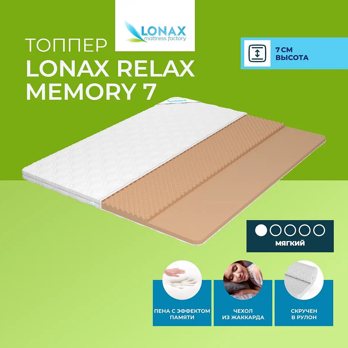 Топпер Lonax Relax Memory 7 — это мягкий беспружинный матрас-топпер для комфортного сна и обновления спального места. Благодаря высоте 7 см и двухслойной структуре из мемориформ с массажным эффектом и memory-пеной, изделие мягко подстраивается под контуры тела, снижая давление и способствуя качественному отдыху. Топпер хорошо подходит для тех, кто ищет мягкий матрас для повседневного использования, а также для смягчения жёсткой поверхности дивана или матраса. Съёмный чехол из хлопкового жаккарда отличается аккуратным внешним видом и приятной фактурой. Материал чехла устойчив к истиранию и сохраняет привлекательность длительное время. Для фиксации на кровати предусмотрены резинки или липучки по углам — вы можете выбрать удобный вариант крепления. Топпер Lonax Relax Memory 7 поставляется в скрученном виде, что упрощает транспортировку и хранение. Характеристики