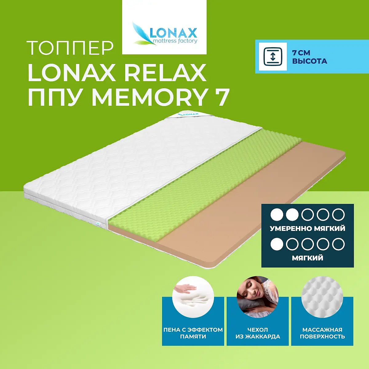 Тонкий матрас-топпер Lonax Relax ППУ Memory 7 — это практичное решение для улучшения комфорта сна на любой поверхности. Благодаря двум рабочим сторонам с разной степенью мягкости, топпер позволяет выбрать наиболее удобный для себя вариант: одна сторона умеренно мягкая с выраженным массажным эффектом, вторая — мягкая, с эффектом памяти. Высота изделия составляет 7 см, что обеспечивает заметную поддержку и комфорт для ежедневного использования. Верхний слой из пенополиуретана с массажной поверхностью (3 см) деликатно поддерживает тело и способствует расслаблению, а слой мемориформ (4 см) мягко подстраивается под контуры, снижая точечное давление. Съемный чехол выполнен из хлопкового жаккарда — этот материал отличается прочностью, аккуратным внешним видом и приятен к коже. Для фиксации на кровати или диване предусмотрены надежные крепления: на выбор — резинки или липучки по углам. Топпер легко использовать и на стандартном матрасе, и на раскладной мебели. Свойства и характеристики