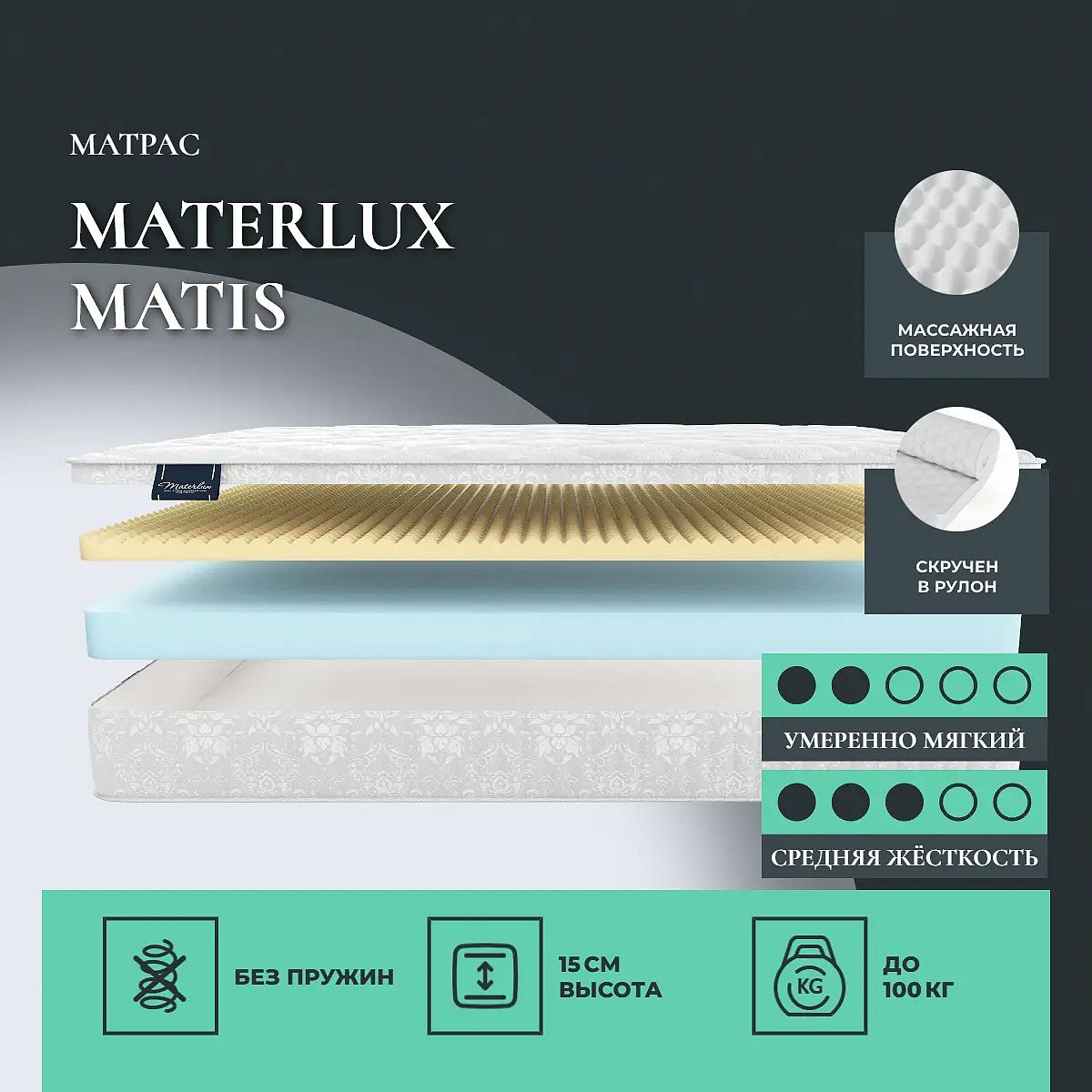 Максимальная нагрузка на одно спальное место: до 100 кг. Высота матраса: 15 см. Матрас поставляется в скрученном виде. В таком виде матрас может храниться не более 60 дней. Акция