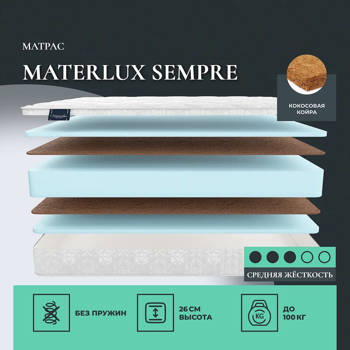 Матрас «Materlux Sempre» — средней жесткости, которая комфортна большинству людей среднего телосложения. Это — универсальный вариант и детям, и взрослым, и пожилым людям.