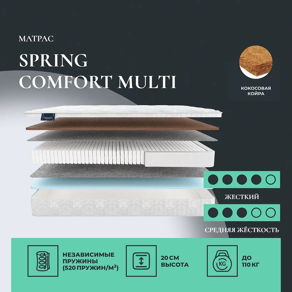 Кокос — натуральный материал, койра отлично дышит, придает матрасу «Spring Comfort Multi» жесткость и упругость.