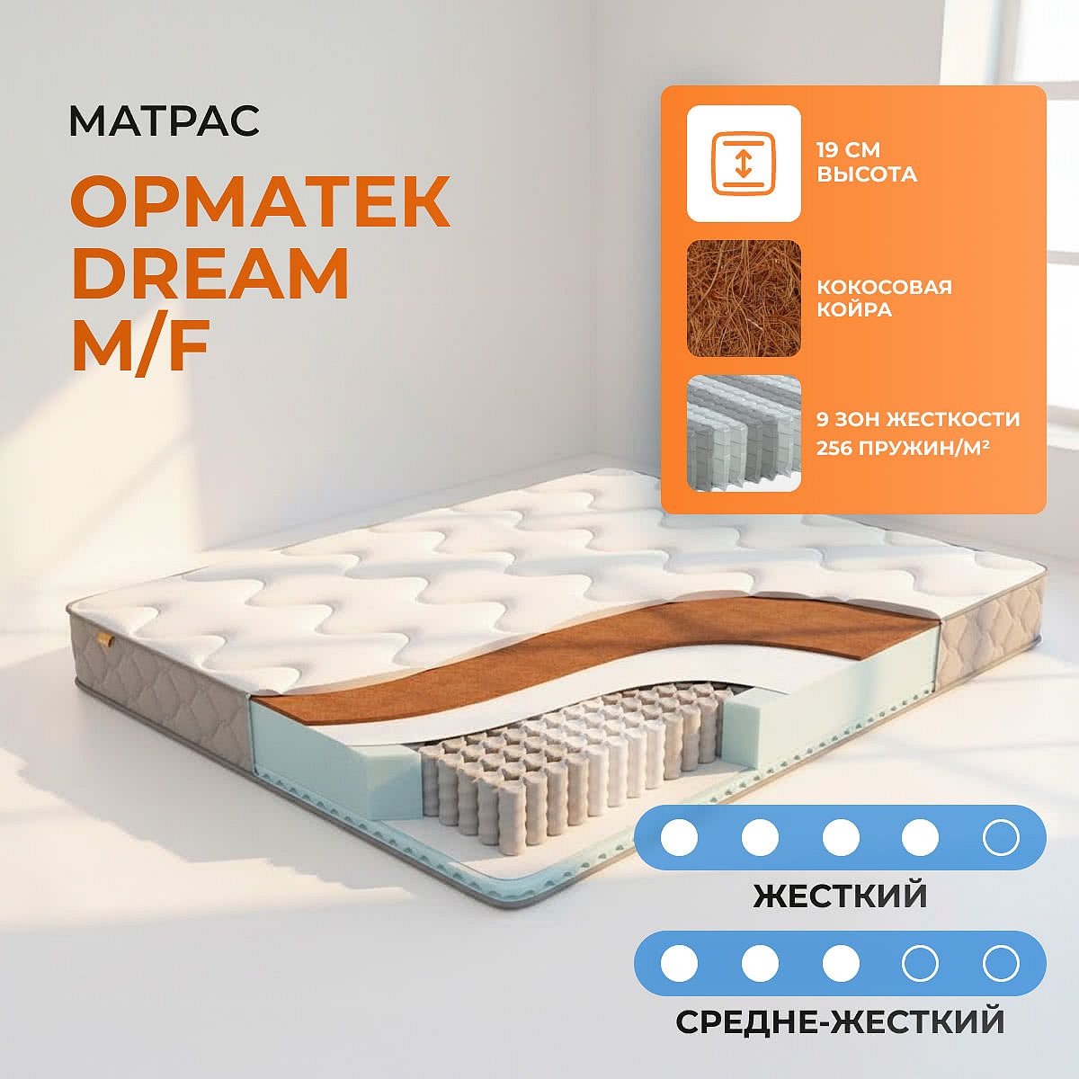 Матрас Орматек Dream M/F — это современное решение для комфортного сна с разной степенью жесткости сторон. Одна сторона матраса — жесткая за счет слоя натуральной кокосовой койры, вторая — средней жесткости с ячеистой пеной Ormafoam. Благодаря этому матрас можно легко адаптировать под индивидуальные предпочтения, просто перевернув его. В основе лежит 9-зонный независимый пружинный блок EVS-9 zone с плотностью 256 пружин на м2, который обеспечивает точечную поддержку тела и помогает сохранять правильное положение позвоночника. Усиление боковин по всему периметру делает конструкцию более устойчивой и увеличивает полезную площадь спального места. Мягкий трикотажный чехол приятен на ощупь, а долговечный бурлет из мебельной ткани аккуратно завершает внешний вид матраса. Характеристики