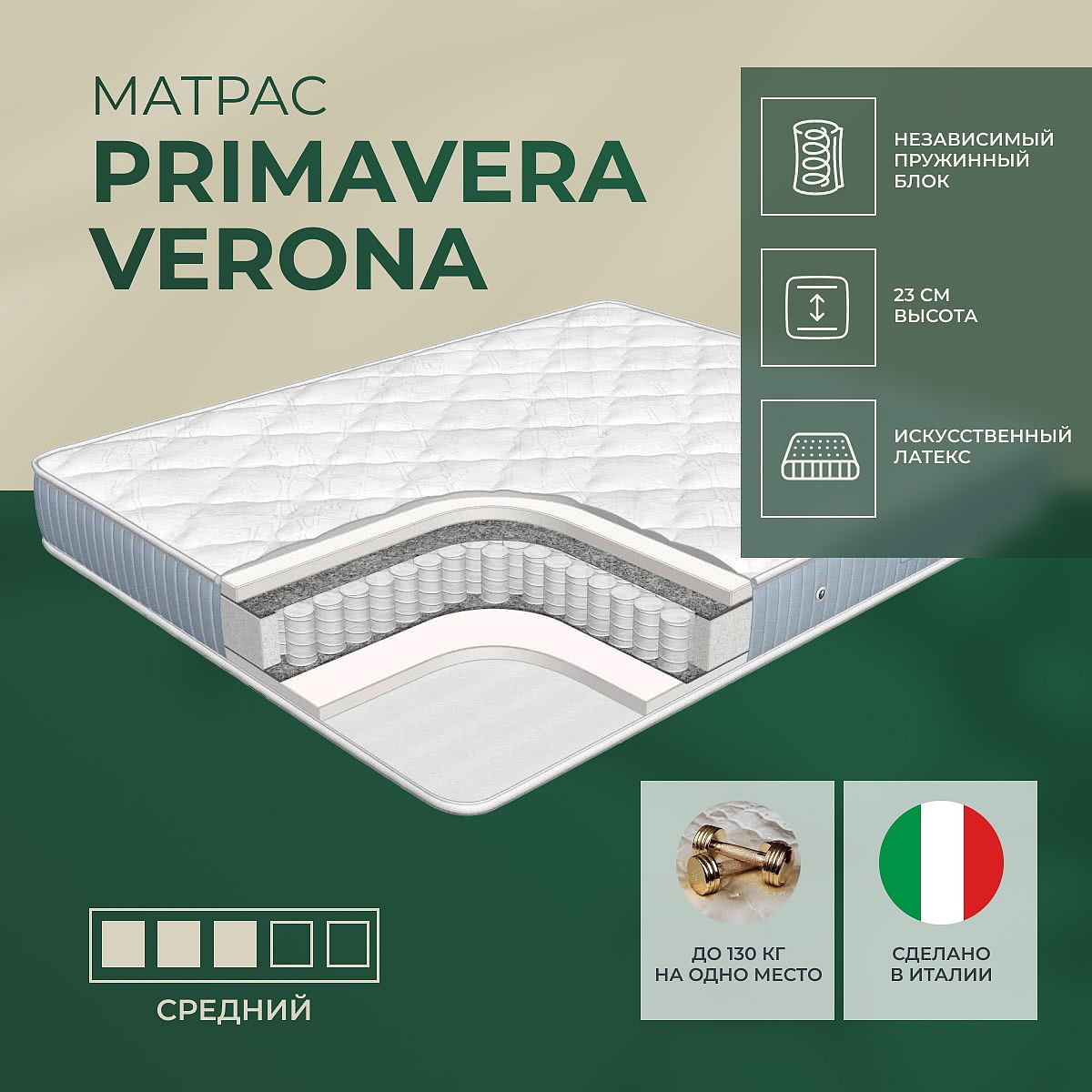 Матрас «Primavera Verona» — средней жесткости, которая подходит большинству людей среднего телосложения. Это — оптимальный выбор и детям, и взрослым, и пожилым людям.
