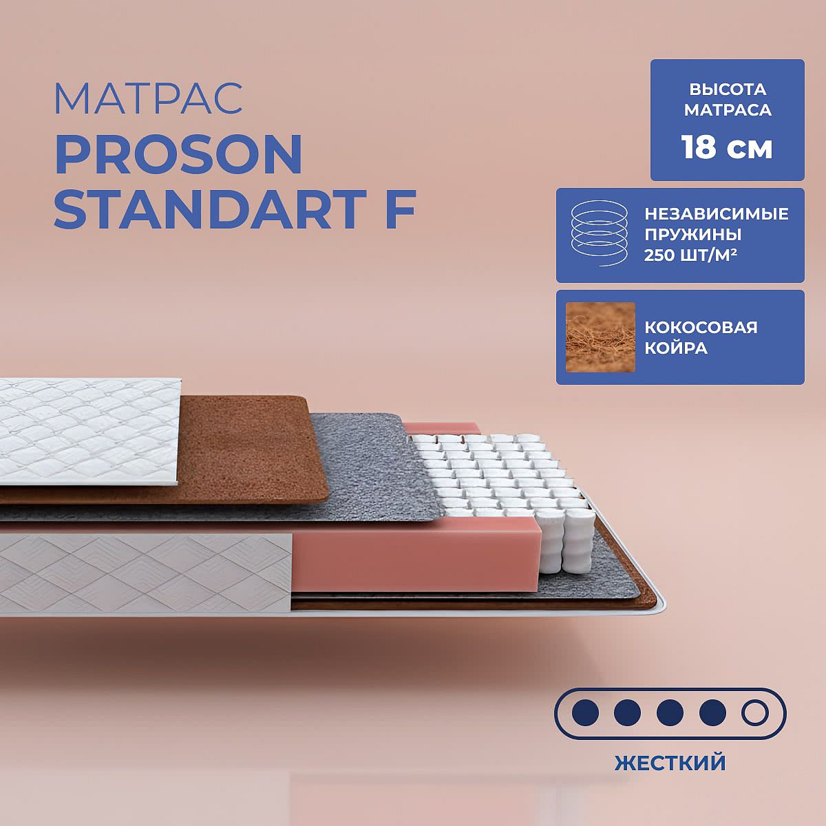 Матрас высокой жесткости «ProSon Standart F» — оптимальный выбор для уверенной поддержки позвоночника. Именно такие модели обычно рекомендуют подросткам, спортсменам или людям с проблемами позвоночника.