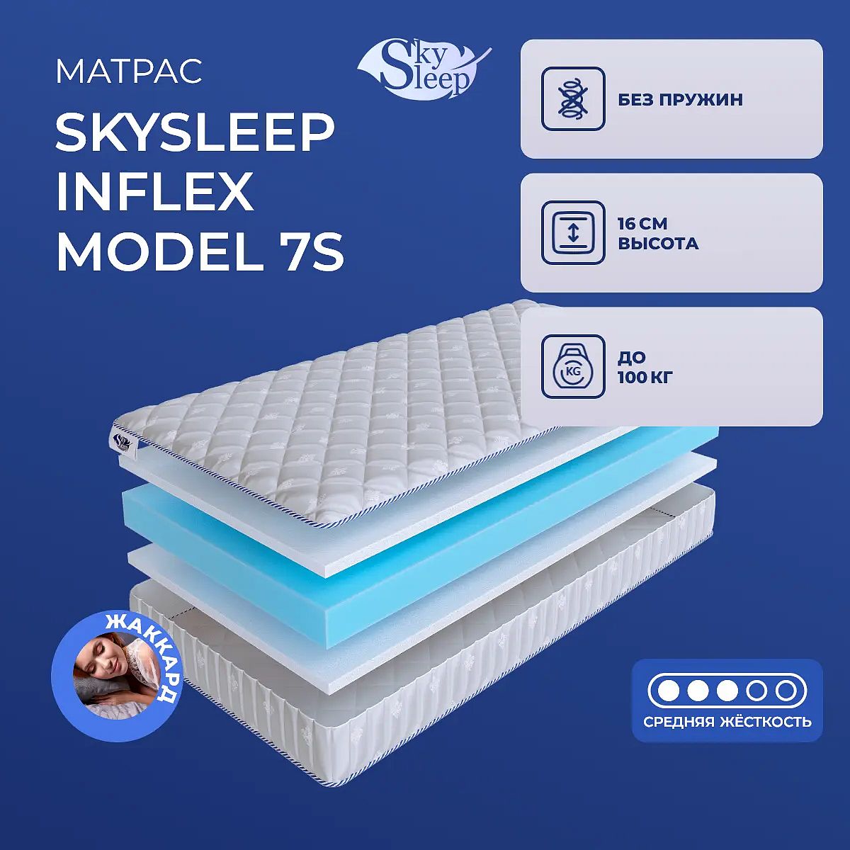 Матрас Skysleep InFlex Model 7s — это беспружинный матрас средней жесткости, созданный для ежедневного комфортного сна. Благодаря комбинации современных материалов он обеспечивает аккуратную поддержку и приятные тактильные ощущения. В основе конструкции — слой холлофайбера толщиной 3 см с обеих сторон и центральный слой ППУ высотой 10 см. Такая структура позволяет равномерно распределять нагрузку, поддерживать позвоночник в естественном положении и сохранять оптимальный микроклимат в течение всей ночи. Чехол выполнен из прочного синтетического жаккарда со стежкой на синтепоне (100 г/м2), что придает матрасу аккуратный внешний вид и облегчает уход. Ключевые особенности