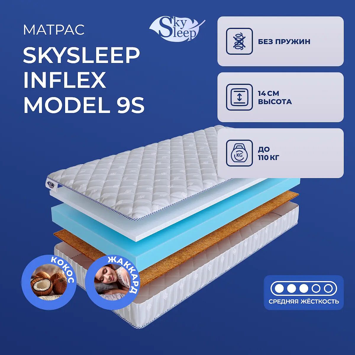Матрас Skysleep InFlex Model 9s — это беспружинная модель средней жесткости, созданная для ежедневного комфортного сна. Благодаря продуманному сочетанию современных материалов, матрас обеспечивает умеренно упругую поддержку и подходит для большинства людей со средним телосложением. Высота изделия составляет 14 см, что удобно для стандартных кроватей и позволяет использовать его как для взрослых, так и для подростков. В основе матраса — толстый слой полиуретановой пены (ППУ) высотой 14 см, придающий изделию необходимую упругость и долговечность. С одной стороны добавлен слой холкона (холлофайбера) толщиной 3 см, который делает поверхность мягче и приятнее для сна. Другая сторона усилена кокосовой койрой 1 см — это придаёт матрасу дополнительную поддержку и способствует равномерному распределению нагрузки. Чехол выполнен из прочного синтетического жаккарда с простёжкой на синтепоне 100 г/м2, что обеспечивает аккуратный внешний вид и лёгкость в уходе. Ключевые особенности